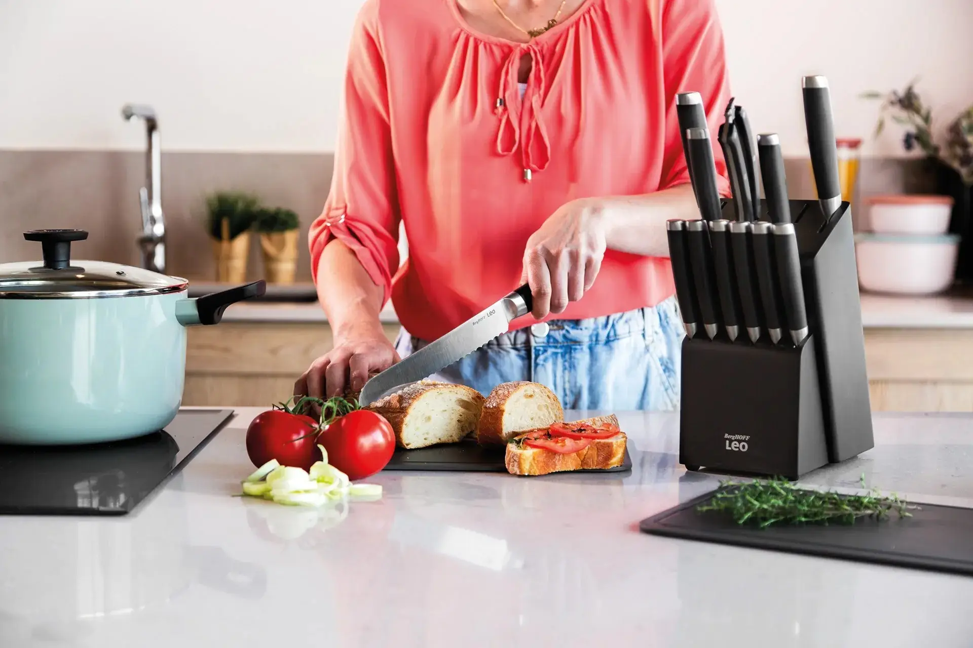 Nóż do chleba BergHOFF Leo Graphite 20 cm to niezawodne narzędzie do krojenia chrupiącego pieczywa, świeżych wypieków oraz owoców i warzyw o twardej skórce. Dzięki ząbkowanemu ostrzu bez trudu przecina twardą skórkę, nie zgniatając delikatnego wnętrza.