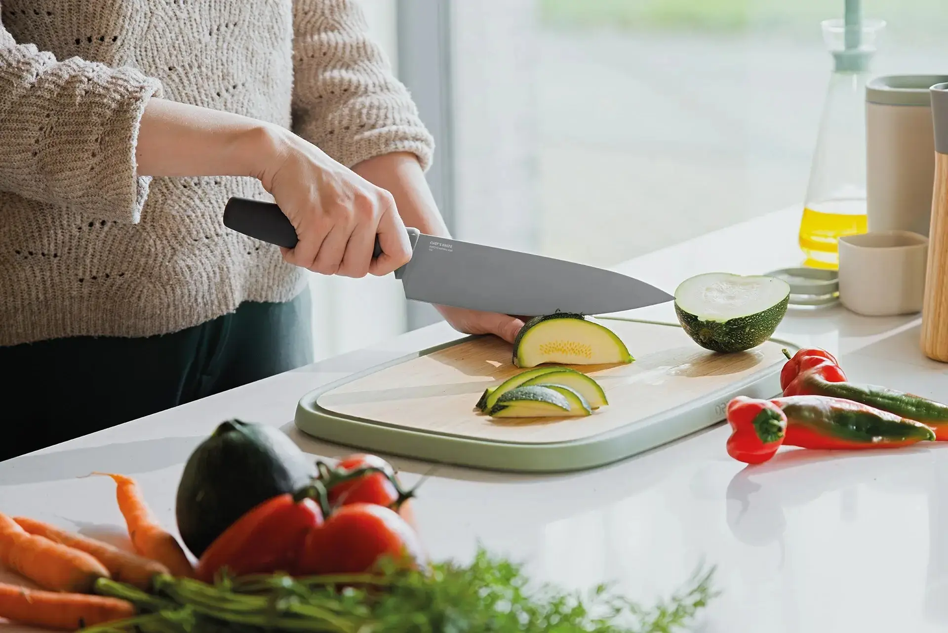 Ostrze wykonane z wysokiej jakości stali nierdzewnej zostało pokryte nieprzywierającą powłoką, która zapobiega przyklejaniu się składników podczas pracy. Zakrzywiona ku górze końcówka umożliwia kołyszący ruch noża, zapewniając płynne i precyzyjne krojenie.