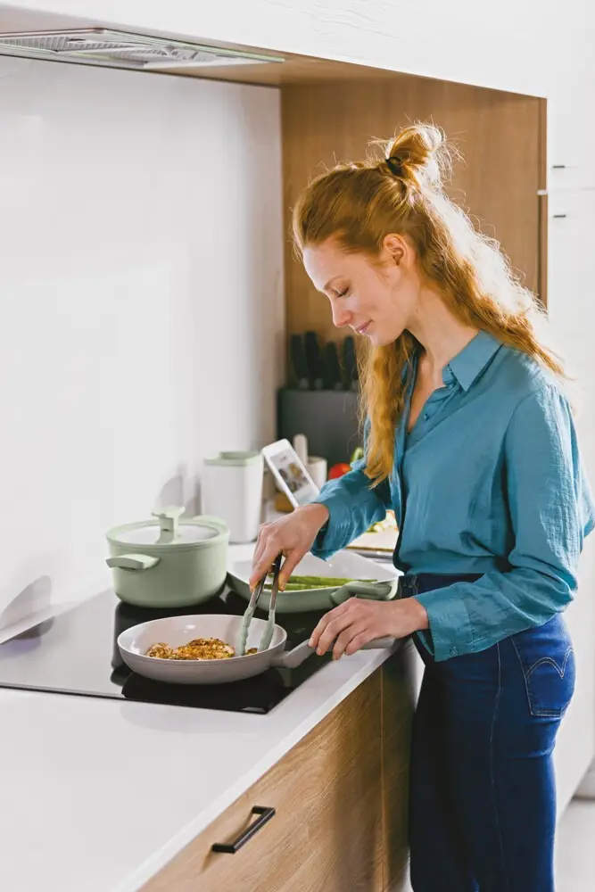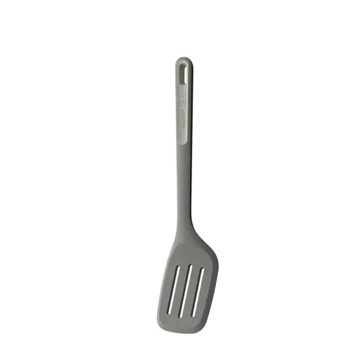 Antypoślizgowa rączka z wygodnymi podpórkami na kciuki zapewnia pewny i komfortowy chwyt, a odporne na wysoką temperaturę silikonowe końcówki są bezpieczne dla naczyń z powłoką nieprzywierającą – nie rysują ich powierzchni.