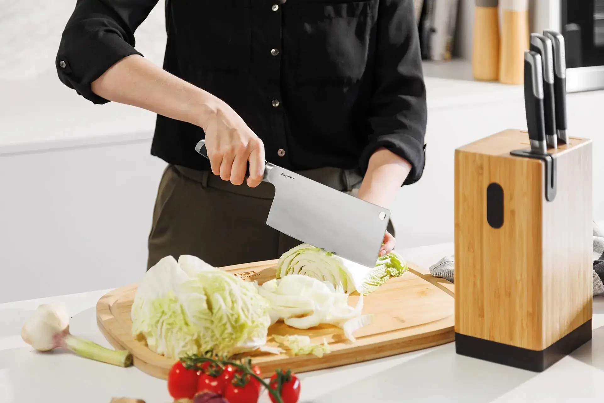 Dzięki kutemu ostrzu ze stali nierdzewnej tasak bez trudu radzi sobie również z kośćmi i twardszymi składnikami. Idealnie nachylona krawędź tnąca umożliwia ultra-cienkie krojenie oraz precyzyjne siekanie.