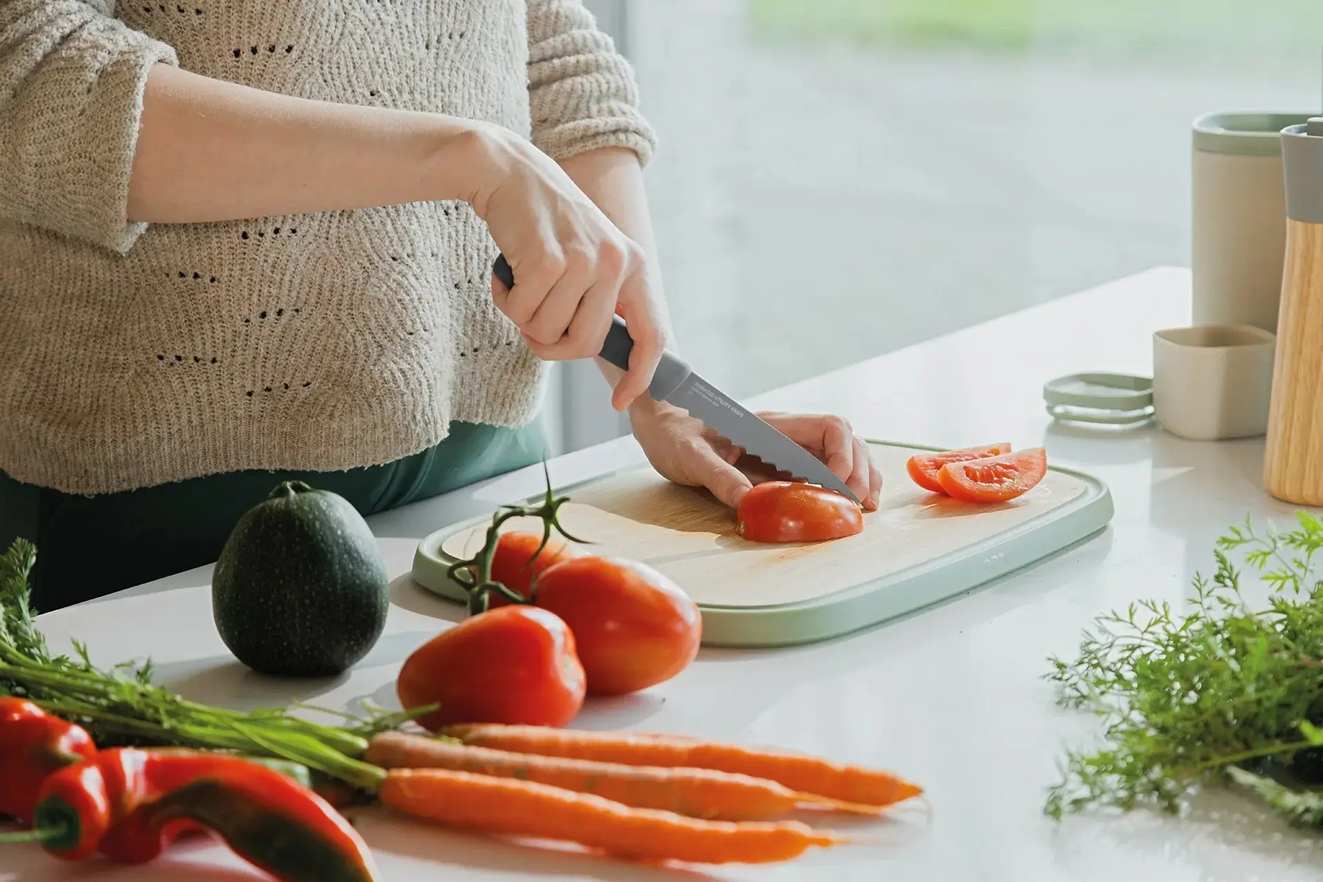 Mniejsze ostrze ze stali nierdzewnej z nieprzywierającą powłoką zapewnia dokładne cięcie bez przyklejania się składników, a ząbkowana krawędź ułatwia krojenie produktów o delikatnej skórce i miękkim wnętrzu.