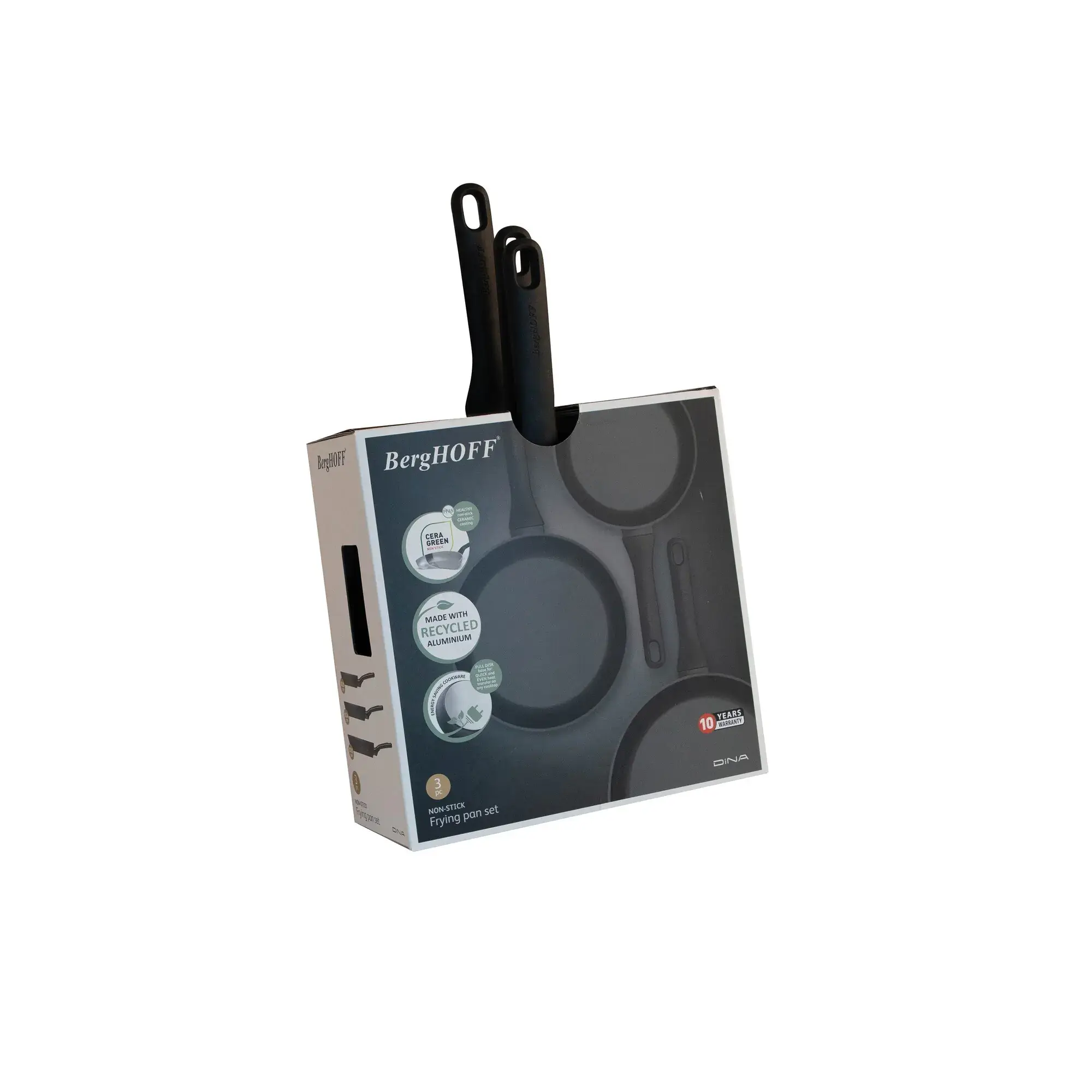 Odkryj wygodę gotowania z 3-częściowym zestawem patelni Helix BergHOFF. Wykonane z recyklingowanego aluminium i pokryte ceramiczną powłoką CeraGreen (bez PFAS), patelnie te gwarantują zdrowe i lekkie gotowanie z minimalną ilością tłuszczu.