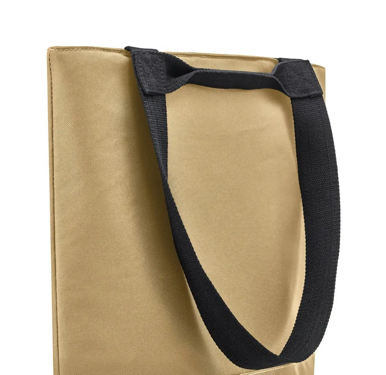 Prezentowana torba w kolorze beżowym o wymiarach 40 x 42 x 14 cm (szer. x wys. x gł.) wykonana została z materiału pochodzącego z recyklingu (tworzyw PET, PEVA, tkaniny polycotton). Produkt wyposażono w rozwiązania, które sprawiają, że jest on odpowiednio praktyczny: oddziela od siebie zawartość i utrzymuje jej niską temperaturę przez dłuższy czas. Ponadto nie przemaka i posiada wygodne uchwyty (zarówno długie jak i krótkie), umożliwiające łatwe przenoszenie. Torba jest łatwa w używaniu - jest zasuwana i stabilna (nawet pusta się nie deformuje). Produkt należy czyścić ręcznie - wystarczy przecieranie wilgotną ściereczką.