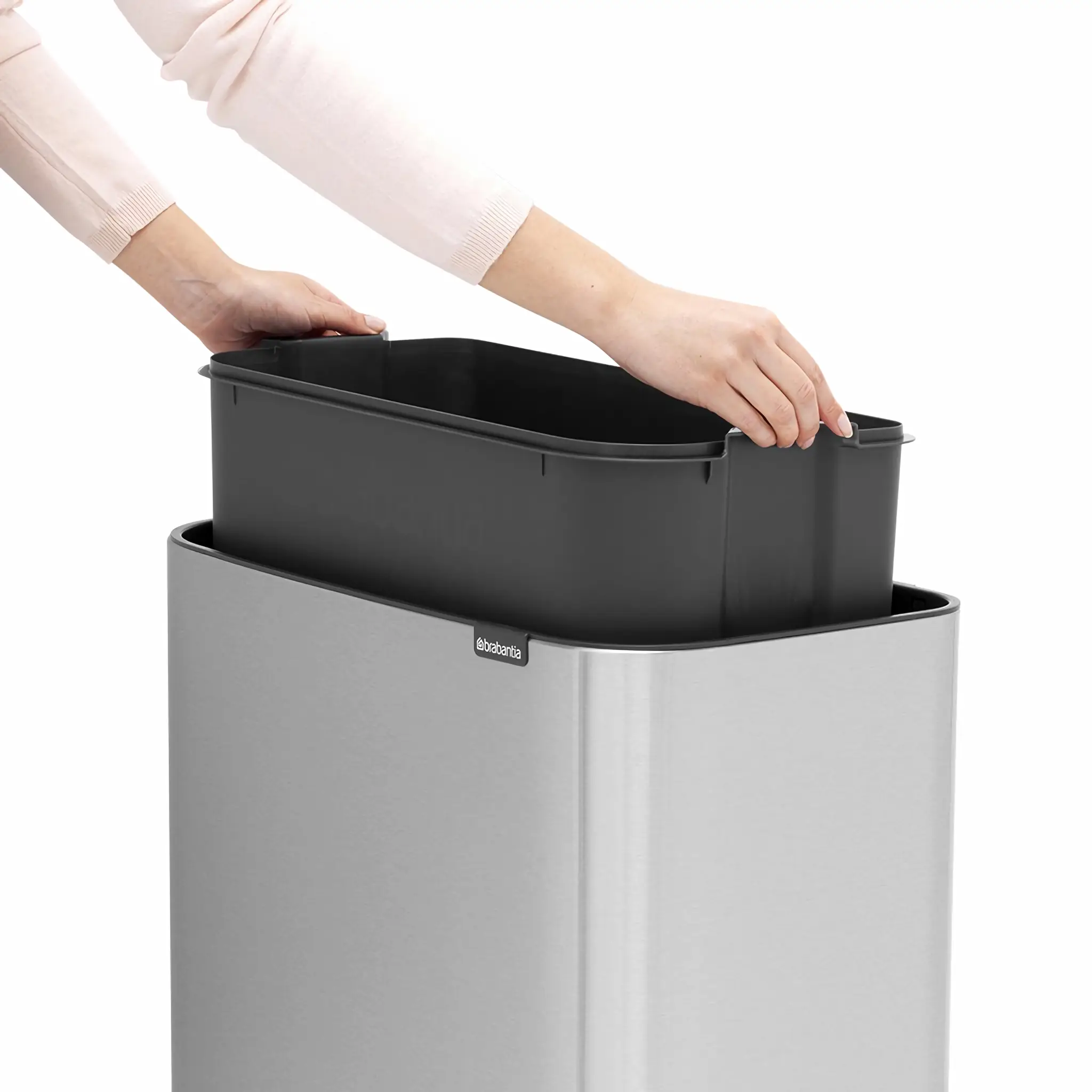 Brabantia Bo to seria koszy łącząca piękny design z dużą pojemnością użytkową. Dotykowa pokrywa "Soft-Touch" z ulepszonym mechanizmem otwierania otwiera się i zamyka łatwiej niż kiedykolwiek. Aby go otworzyć wystarczy lekki dotyk pokrywy. Dzięki wyjątkowemu zawiasowi pokrywa otwiera się cicho i dyskretnie. Wyjmowane wewnętrzne, plastikowe wiaderko, ułatwia wymianę worków. Dzięki dużemu otworowi wrzutowemu bez problemu pozbędziemy obszernych odpadów bez ryzyka pobrudzenia kosza. Nóżki zostały wyposażone w antypoślizgowe nakładki, zapobiegające zarysowaniom podłogi.