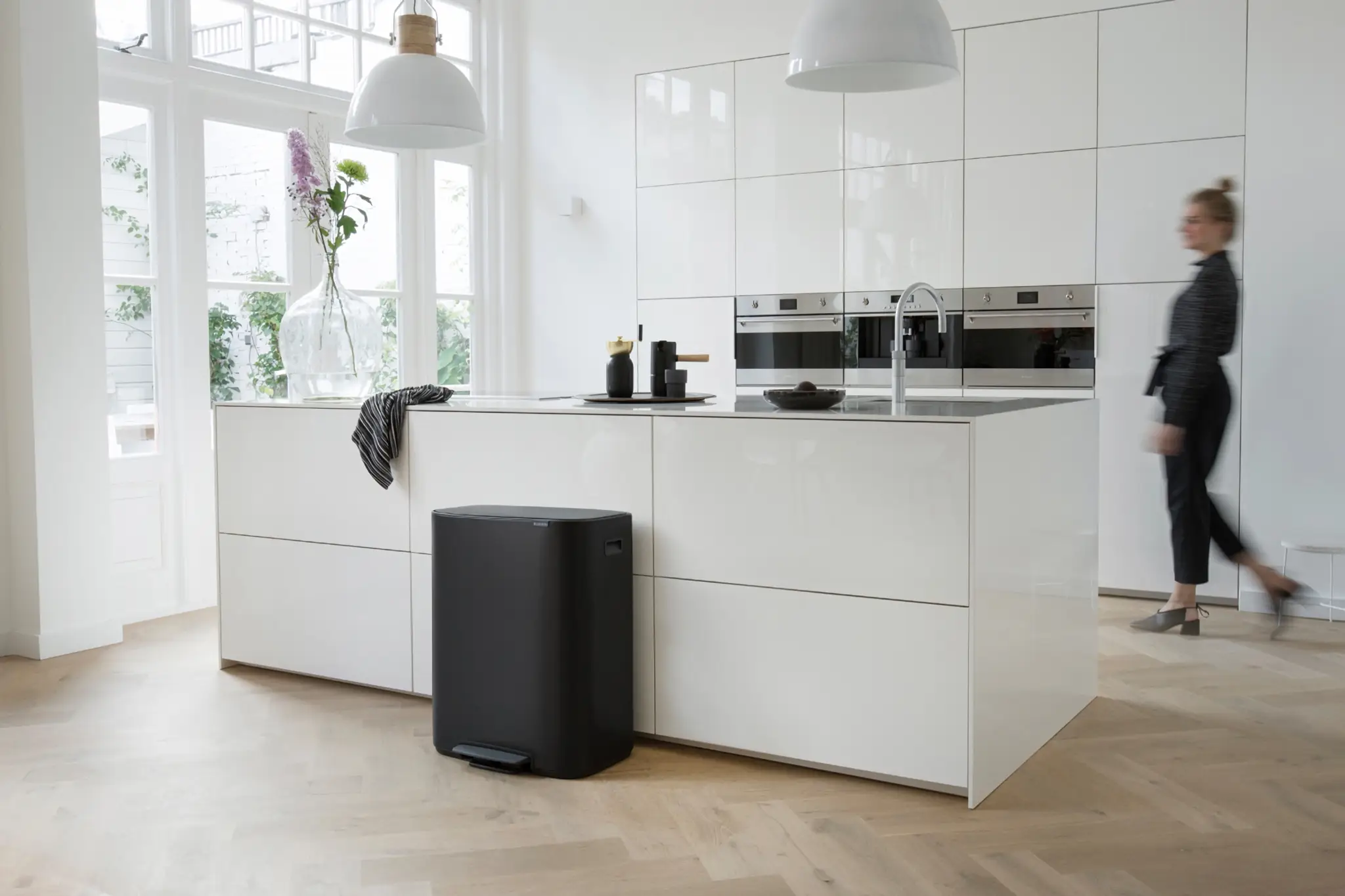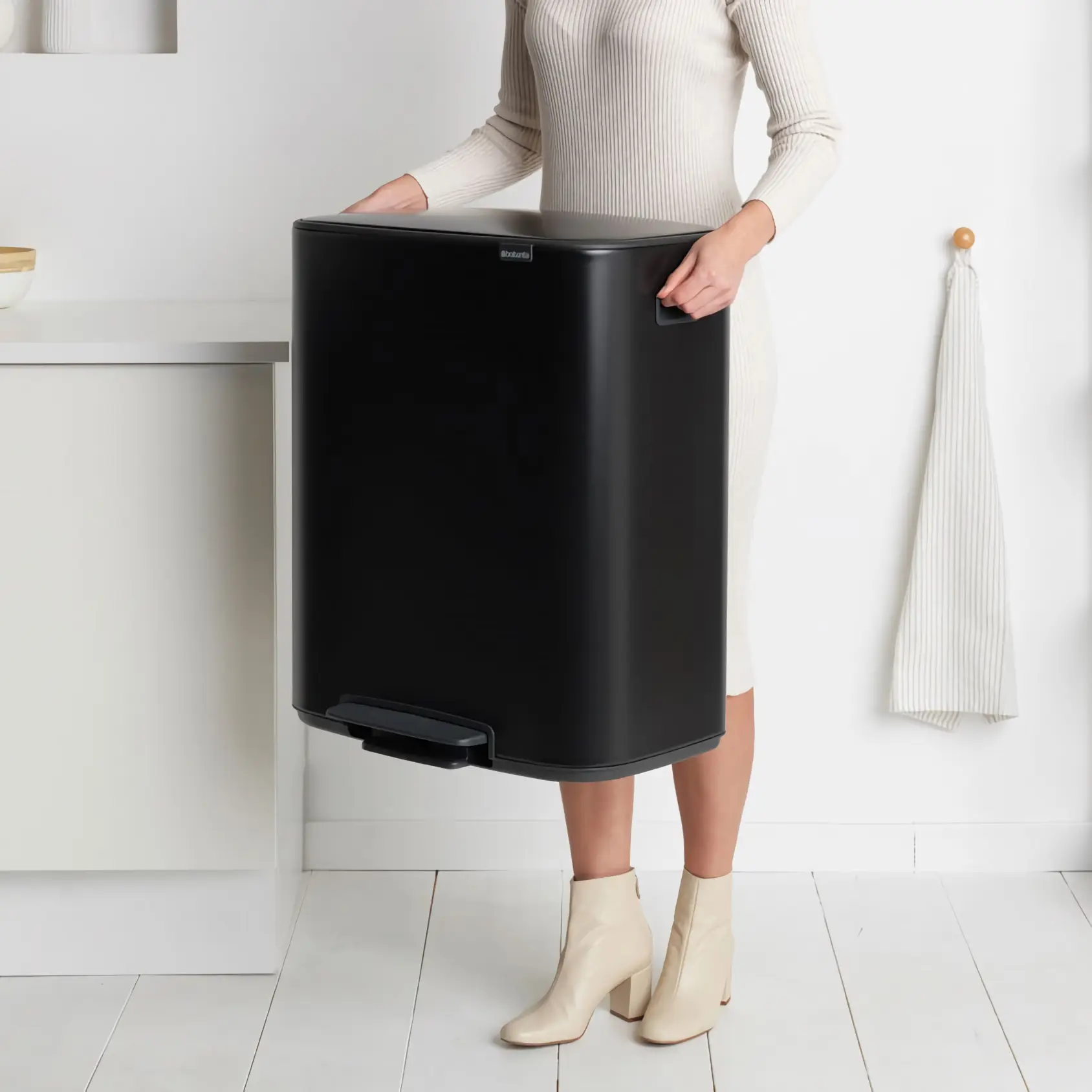Brabantia Bo to seria koszy łącząca piękny design z dużą pojemnością użytkową. Pokrywa "Soft-Touch" z ulepszonym mechanizmem otwierania otwiera się i zamyka łatwiej niż kiedykolwiek. Dzięki wyjątkowemu zawiasowi pokrywa otwiera się cicho i dyskretnie. Wyjmowane wewnętrzne, plastikowe wiaderko, ułatwia wymianę worków. Dzięki dużemu otworowi wrzutowemu bez problemu pozbędziemy obszernych odpadów bez ryzyka pobrudzenia kosza. Nóżki zostały wyposażone w antypoślizgowe nakładki, zapobiegające zarysowaniom podłogi.