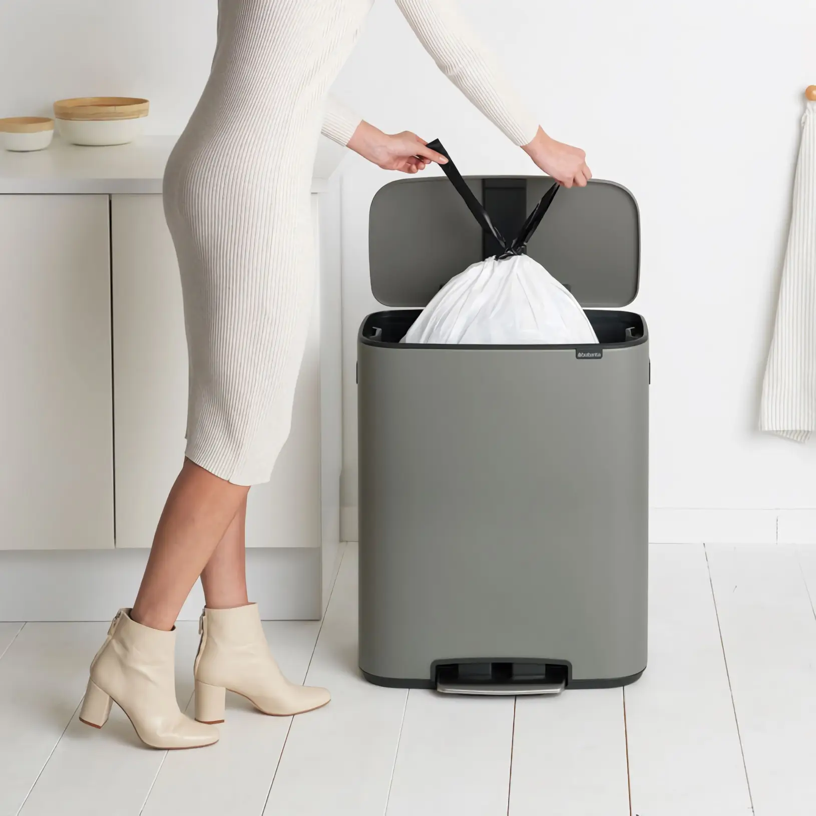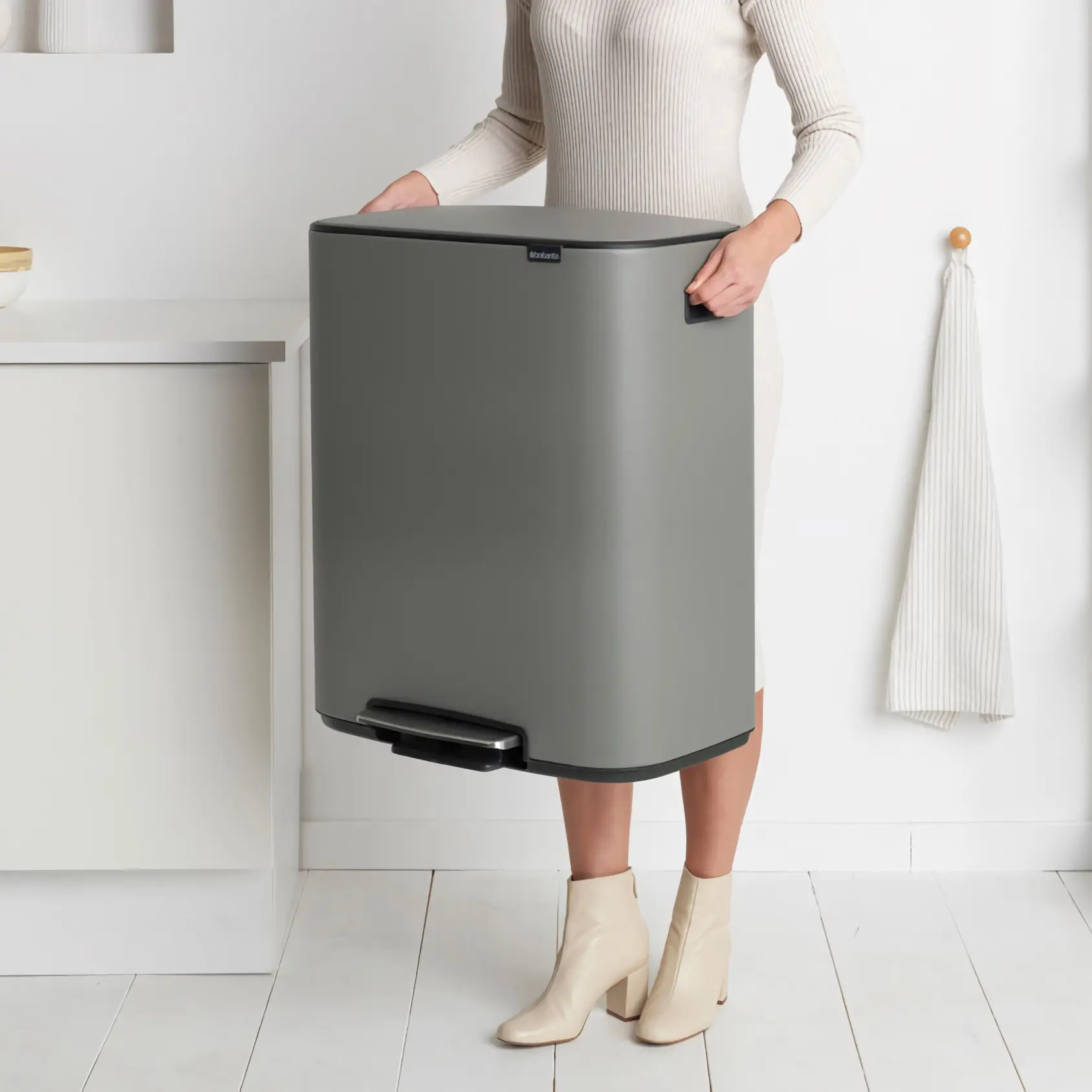 Brabantia Bo to seria koszy łącząca piękny design z dużą pojemnością użytkową. Pokrywa "Soft-Touch" z ulepszonym mechanizmem otwierania otwiera się i zamyka łatwiej niż kiedykolwiek. Dzięki wyjątkowemu zawiasowi pokrywa otwiera się cicho i dyskretnie. Wyjmowane wewnętrzne, plastikowe wiaderko, ułatwia wymianę worków. Dzięki dużemu otworowi wrzutowemu bez problemu pozbędziemy obszernych odpadów bez ryzyka pobrudzenia kosza. Nóżki zostały wyposażone w antypoślizgowe nakładki, zapobiegające zarysowaniom podłogi.