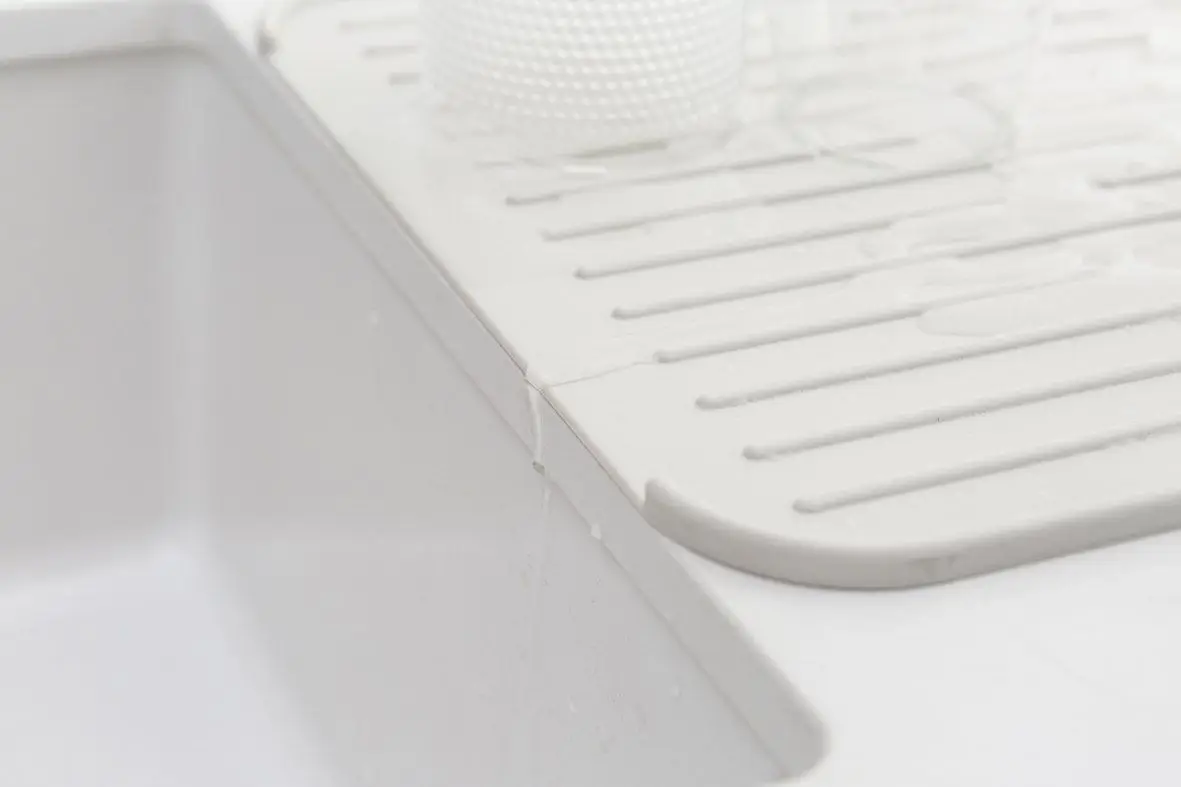 Mata SinkSide jest antypoślizgowa, stabilnie leży na blacie i nie przesuwa się podczas użytkowania. Po zakończeniu pracy można ją łatwo złożyć na pół, co ułatwia przechowywanie nawet w niewielkiej kuchni. Nadaje się również do mycia w zmywarce, co zapewnia wysoki poziom higieny.