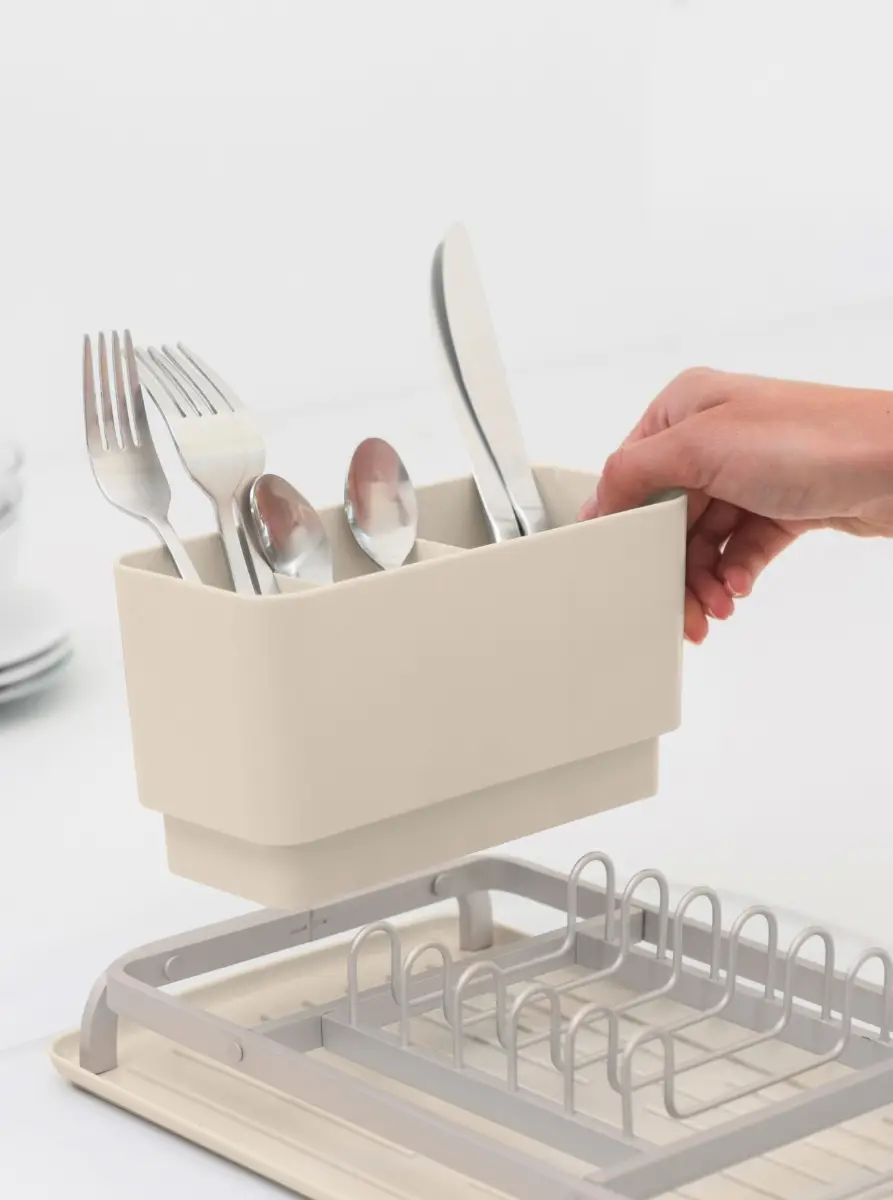 Suszarka do naczyń marki Brabantia posiada wydzielone strefy na garnki, szklanki i miseczki oraz na talerze. Oprócz tego została wyposażona w wyjmowany pojemnik na sztućce. Dzięki swojemu rozmiarowi sprawdzi się doskonale w małych kuchniach oraz tam, gdzie jest zmywarka. Kolorystyka gwarantuje, że wkomponuje się ona w każde wnętrze. Ustawimy na niej kilka talerzy, miseczki, kubki lub dowolne inne naczynie. Posiada ona również łatwy do przenoszenia koszyk na sztućce.