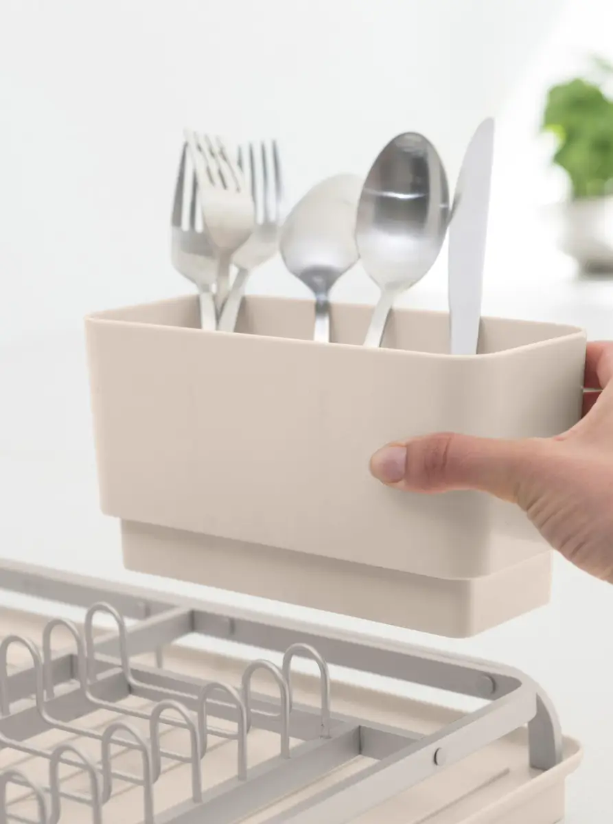 Suszarka do naczyń marki Brabantia posiada wydzielone strefy na garnki, szklanki i miseczki oraz na talerze. Oprócz tego została wyposażona w wyjmowany pojemnik na sztućce. Dzięki swojemu rozmiarowi sprawdzi się doskonale w małych kuchniach oraz tam, gdzie jest zmywarka. Kolorystyka gwarantuje, że wkomponuje się ona w każde wnętrze. Ustawimy na niej kilka talerzy, miseczki, kubki lub dowolne inne naczynie. Posiada ona również łatwy do przenoszenia koszyk na sztućce.