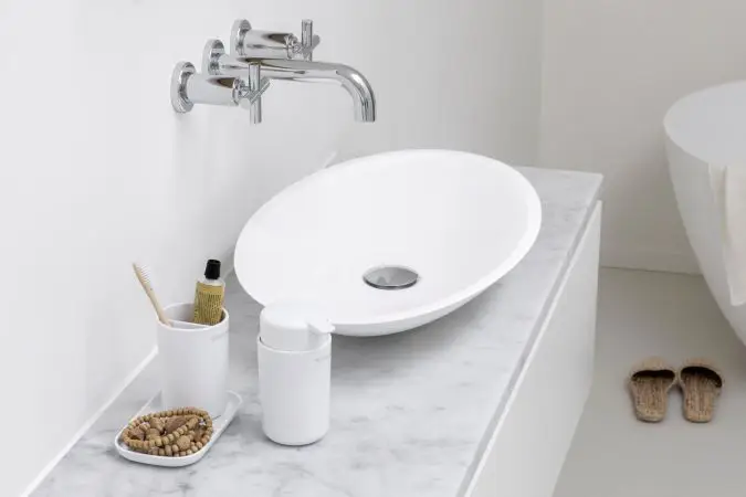- Komplet – dozownik mydła, kubek na szczoteczkę do zębów i tacka.