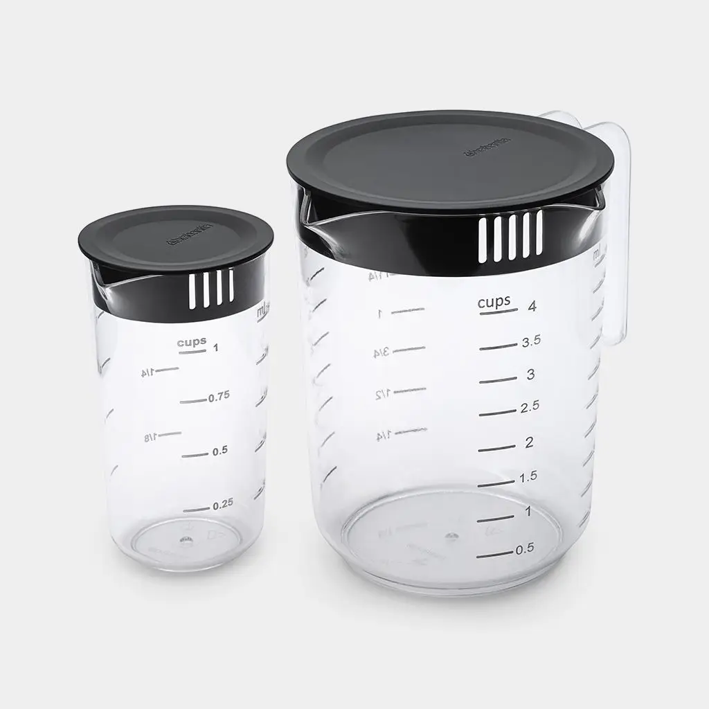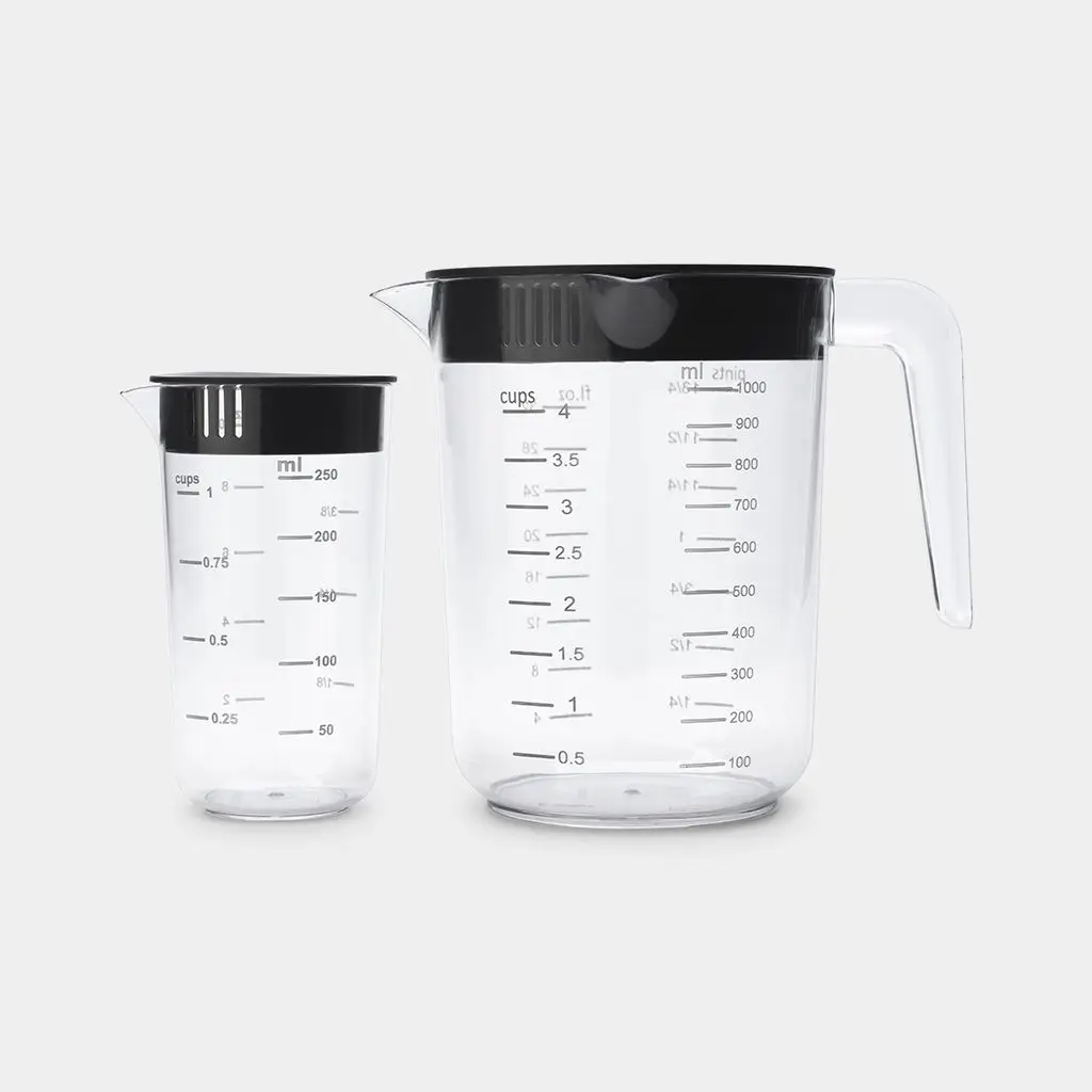 Każda miarka posiada czytelne podziałki w ml, filiżankach, uncjach i pintach, dzięki czemu idealnie sprawdzi się w każdej kuchni – niezależnie od przepisu. Ergonomiczny kształt zapewnia wygodny chwyt i precyzyjne nalewanie, a specjalna pokrywka filtrująca umożliwia nalewanie bez rozlewania i oddzielanie niepożądanych składników.