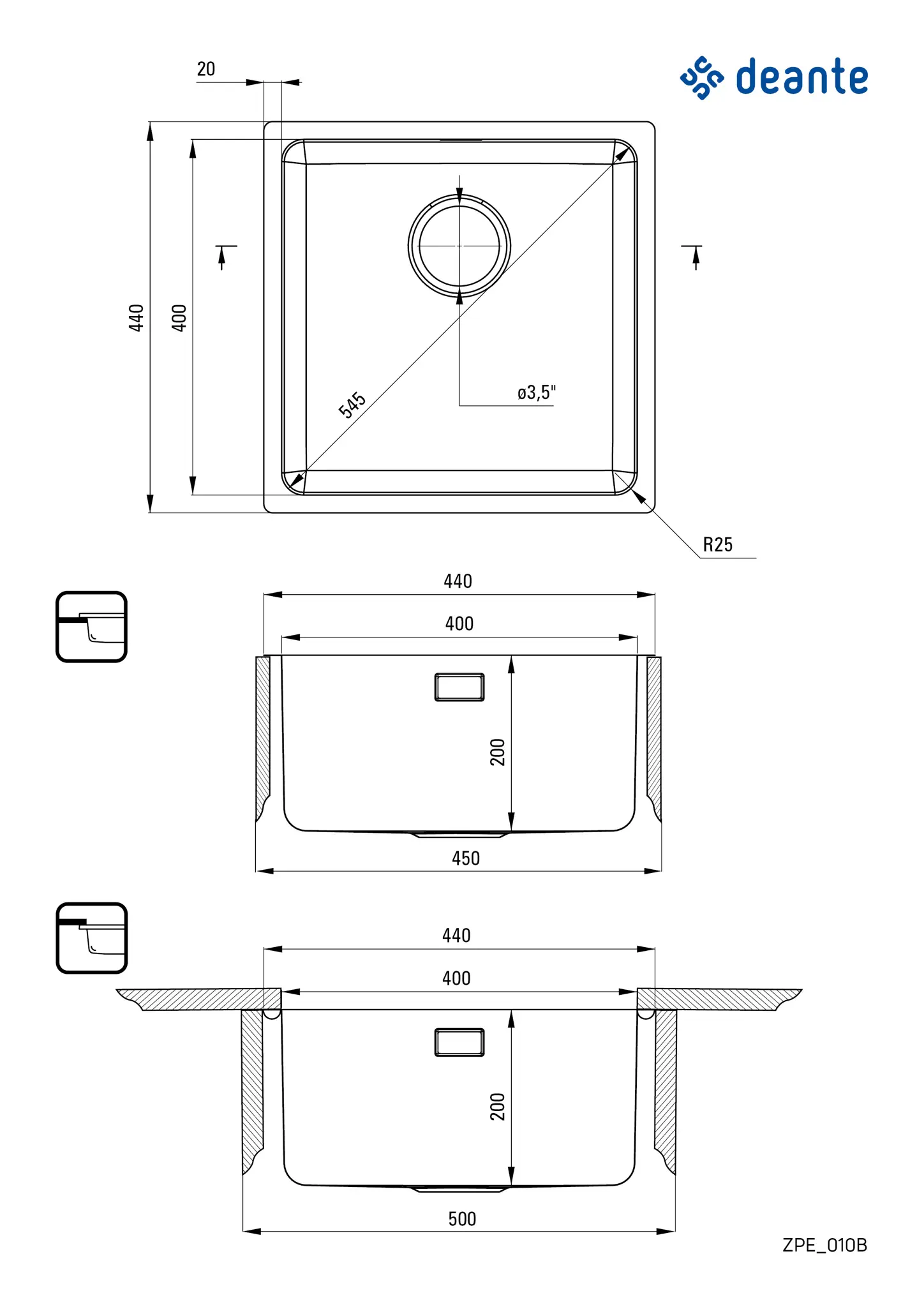 Deante - Zlewozmywak EGERIA stalowy 1-komorowy 44x44 cm