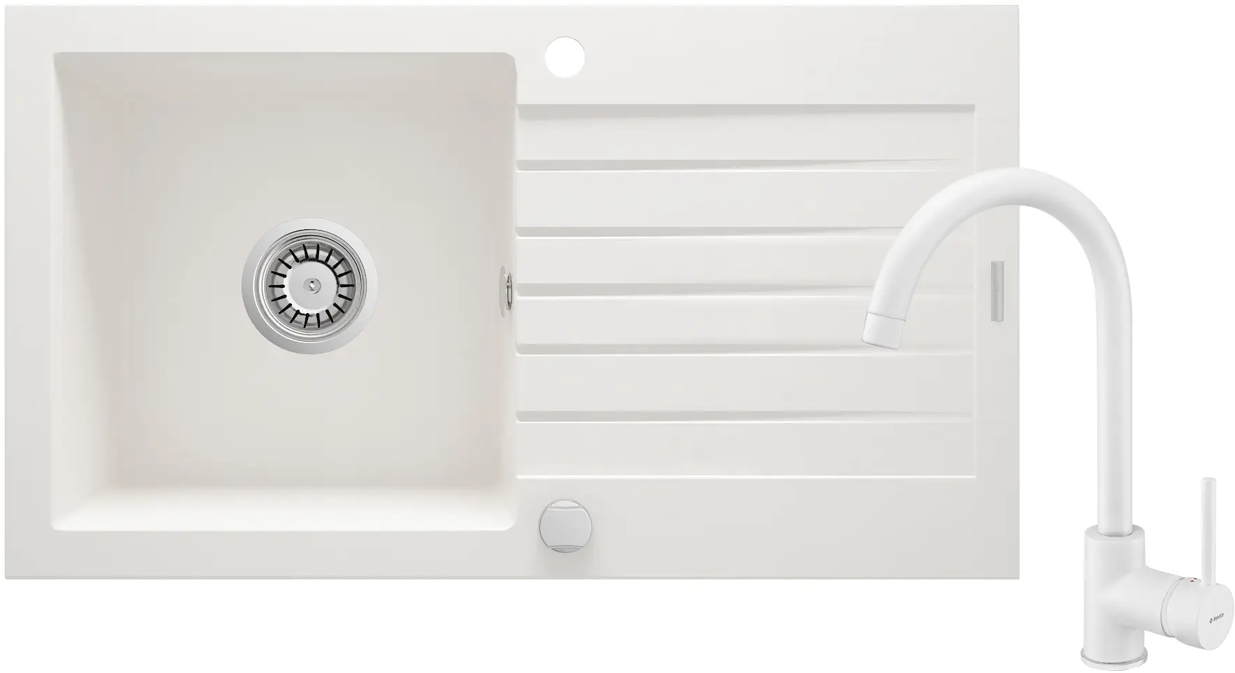 Zlewozmywak jest w zestawie z baterią Milin o kształcie litery "U", która wyróżnia się stałą, wysoką wylewką, umożliwiającą łatwe mycie dużych garnków i naczyń. Charakteryzuje się ona solidną konstrukcją oraz nowoczesnym, minimalistycznym wzornictwem, które doskonale komponuje się z całością zestawu, dodając kuchni elegancji i funkcjonalności.