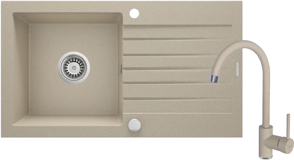 Zlewozmywak jest w zestawie z baterią Milin o kształcie litery "U", która wyróżnia się stałą, wysoką wylewką, umożliwiającą łatwe mycie dużych garnków i naczyń. Charakteryzuje się ona solidną konstrukcją oraz nowoczesnym, minimalistycznym wzornictwem, które doskonale komponuje się z całością zestawu, dodając kuchni elegancji i funkcjonalności.