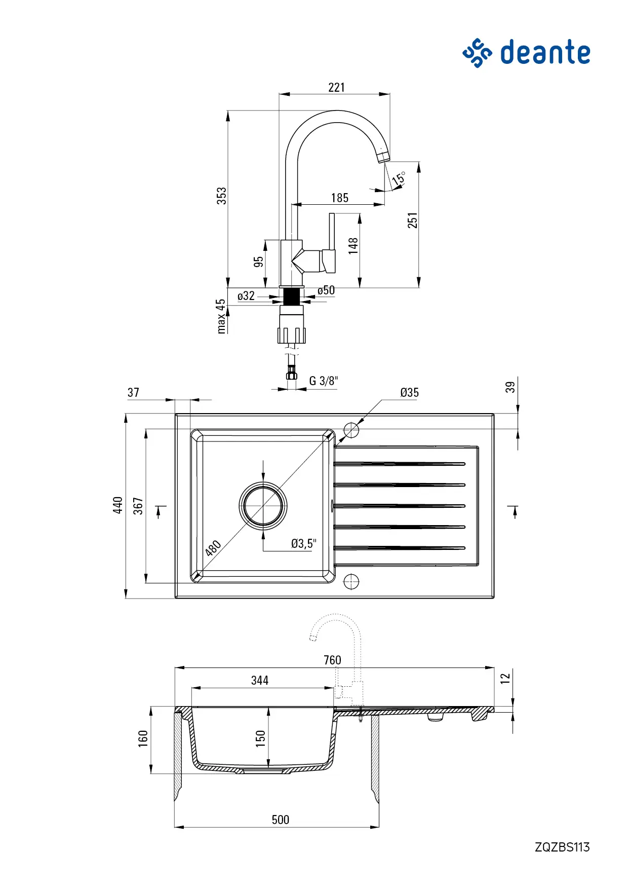 | Średnica odpływu | 3.5'' |