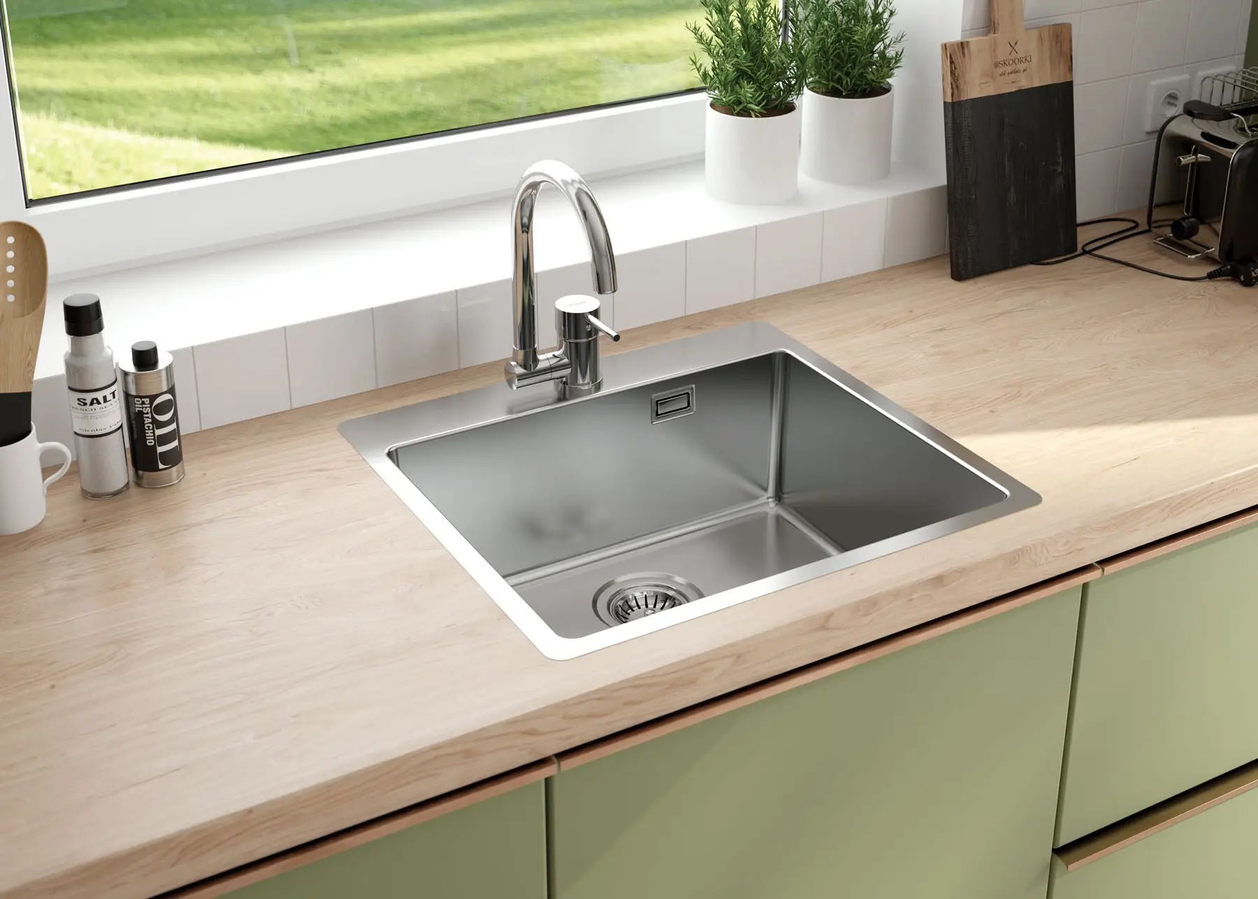 Ponadczasowy zlewozmywak OLFATO wpasuje się w każdą stylistykę kuchni. Posiada klasyczny i elegancki design. W zależności od potrzeb można go zamontować na trzy sposoby: wpuszczany, na równi z blatem, podblatowy. Wykonany jest w wysokiej jakości stali nierdzewnej o grubości 1 mm, która jest odporna na korozję, odbarwienia i wysoką temperaturę. Dodatkowo ma właściwości antyseptyczne. Duża komora zapewnia wygodę w wykonywaniu codziennych czynności w kuchni. Zmieścisz w niej nawet duże blachy.