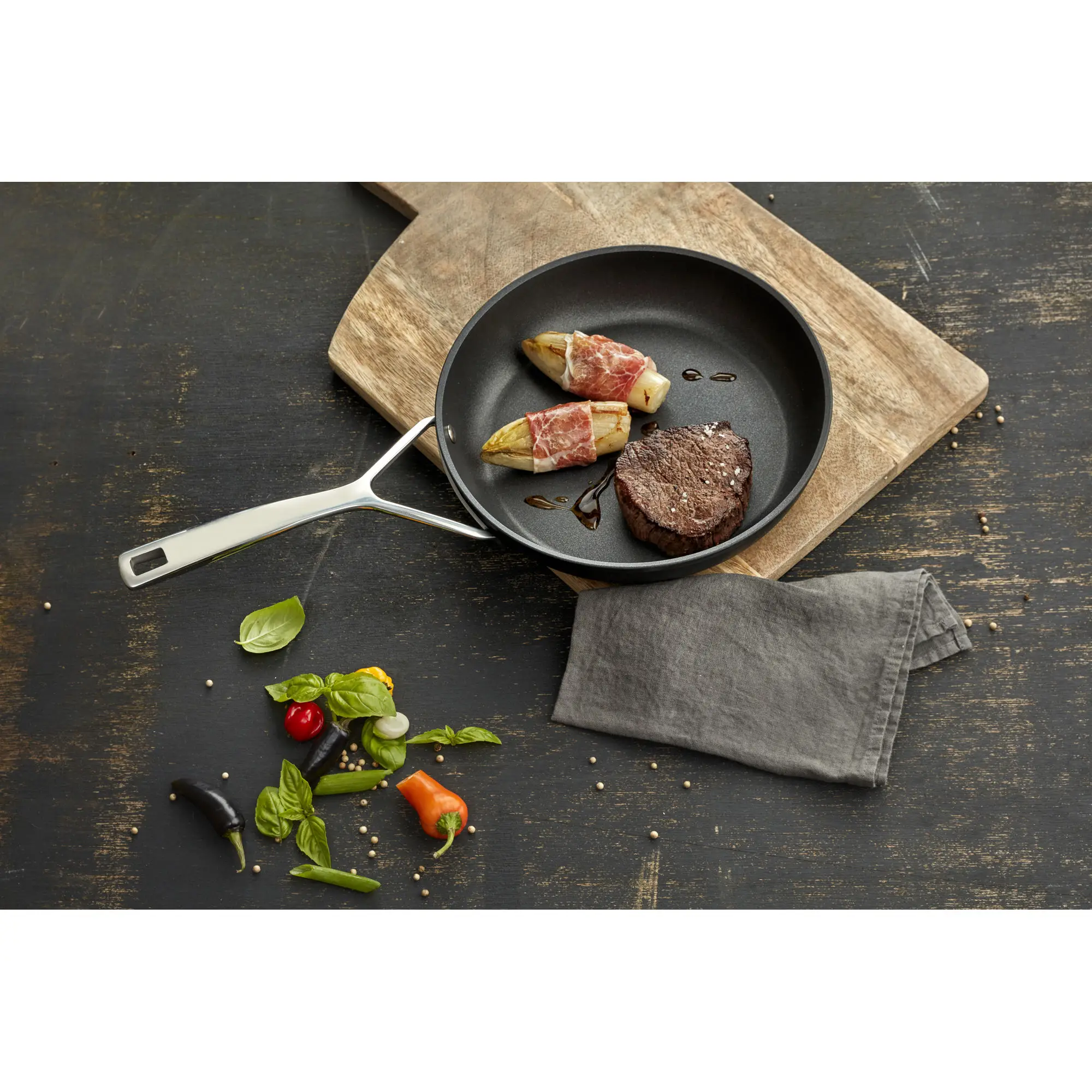 Patelnia tytanowa Alu Pro 32 cm posiada masywną podstawę TriplInduc®, o radialnej strukturze, która błyskawicznie rozgrzewa się. Stalowa warstwa w jej wnętrzu pomaga utrzymać ciepło i daje możliwość stosowania woka na kuchniach indukcyjnych. Powłoka Duraglide® zapobiega przywieraniu potraw. Wygodny, specjalnie wyprofilowany uchwyt ze stali nierdzewnej zapewnia komfortowe użytkowanie.