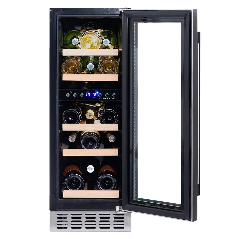 Model wyróżniający się eleganckim wyglądem zewnętrznym i uchwytem drzwi ze stali nierdzewnej. Model DUNAVOX Flow-17 pasuje idealnie do nowoczesnej kuchni. Butelki spoczywają na solidnych drewnianych półkach w oszałamiającym, jasnobiałym wnętrzu. Należy zwrócić uwagę, że model ten jest przeznaczony do zabudowy podblatowej.