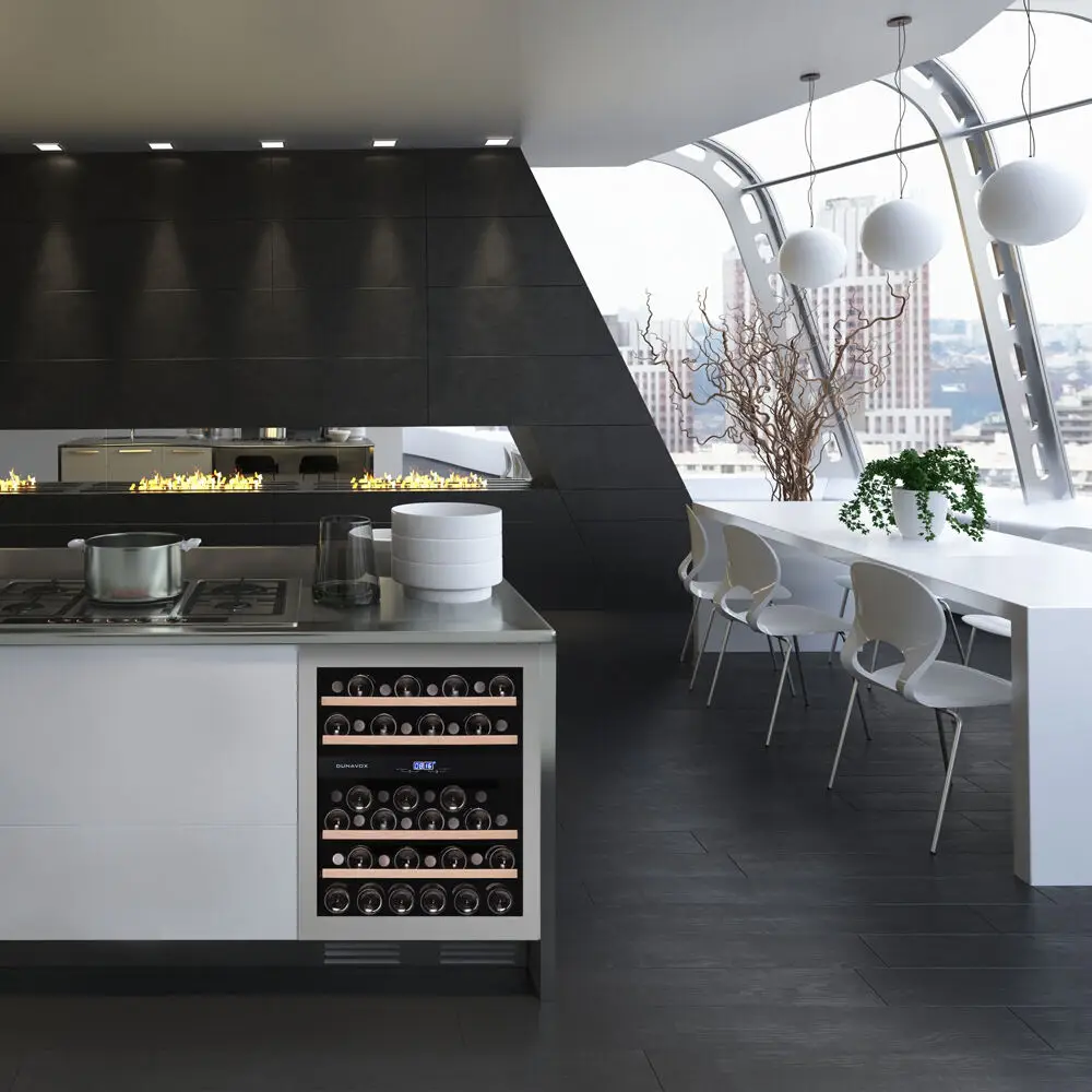Dwustrefowy, model podblatowy mogący pomieścić 45 butelek wina. Elegancki wygląd, bezuchwytowa konstrukcja z technologią push2open idealnie sprawdzi się w każdej nowoczesnej kuchni. Drzwi z przyciemnianego szkła można otworzyć, naciskając ich narożniki, aby uzyskać dostęp do butelek wyeksponowanych na półkach z litego drewna bukowego i otoczonych białym, bursztynowym i niebieskim oświetleniem wewnętrznym LED. Temperatura w górnej strefie musi być niższa niż w dolnej, zalecana różnica temperatur wynosi 4°C. Należy pamiętać, że ten model jest przeznaczony do zabudowy pod blatem.