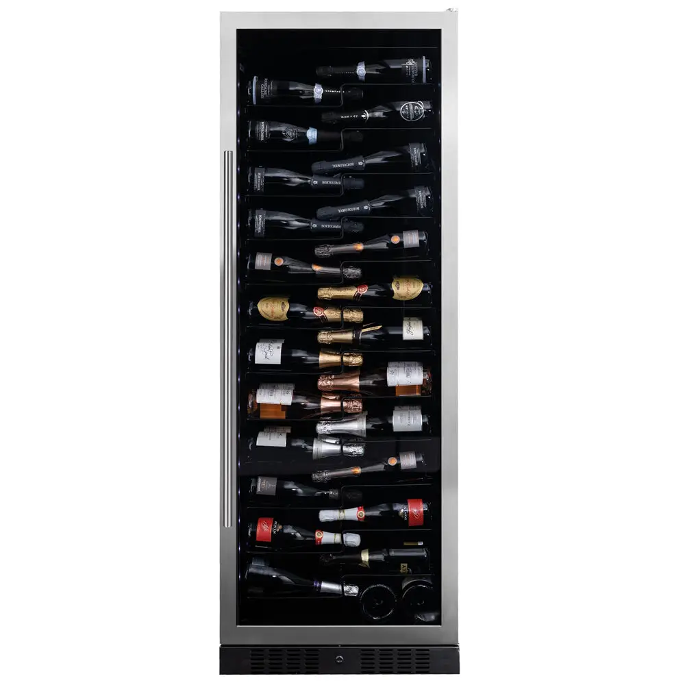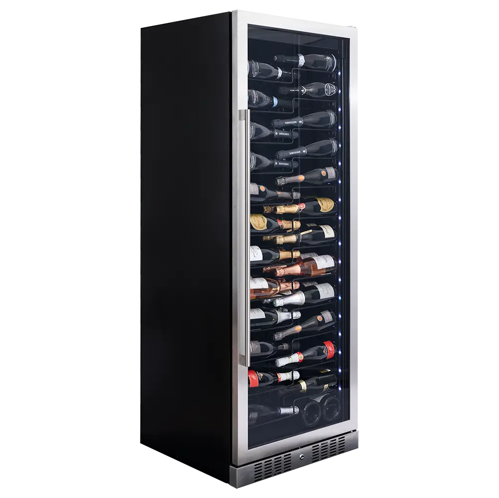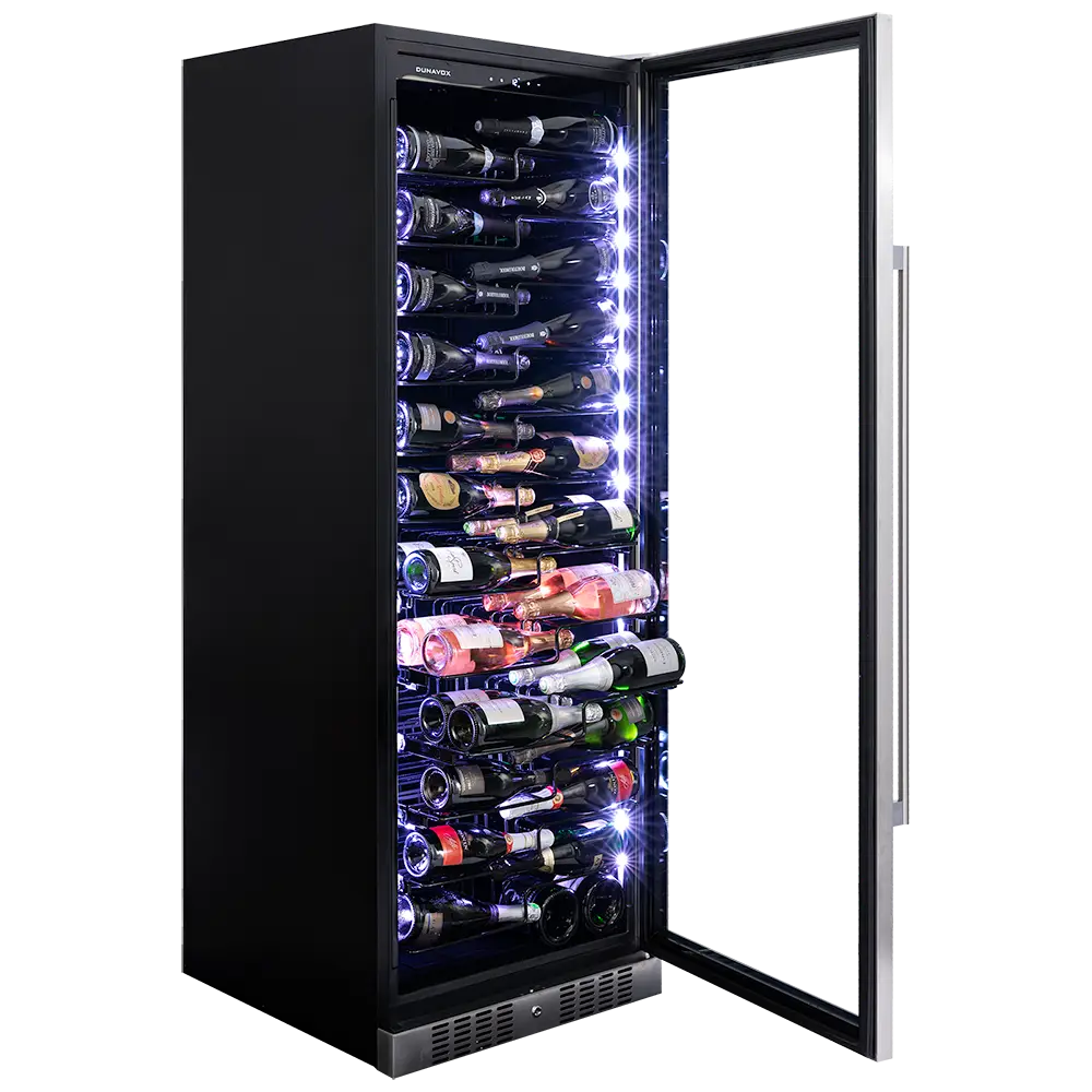 Jednostrefowy, wolnostojący model do przechowywania 143 butelek z serii Sera firmy Dunavox. Elegancki wygląd zewnętrzny - wersja Inox posiada uchwyt ze stali nierdzewnej, a wersja czarna posiada uchwyt również w kolorze czarnym. DUNAVOX Sera-143 pasuje idealnie do nowoczesnych kuchni, restauracji i hoteli. Butelki są umieszczone na opatentowanych półkach i oświetlone z dwóch stron białym, bursztynowym i niebieskim