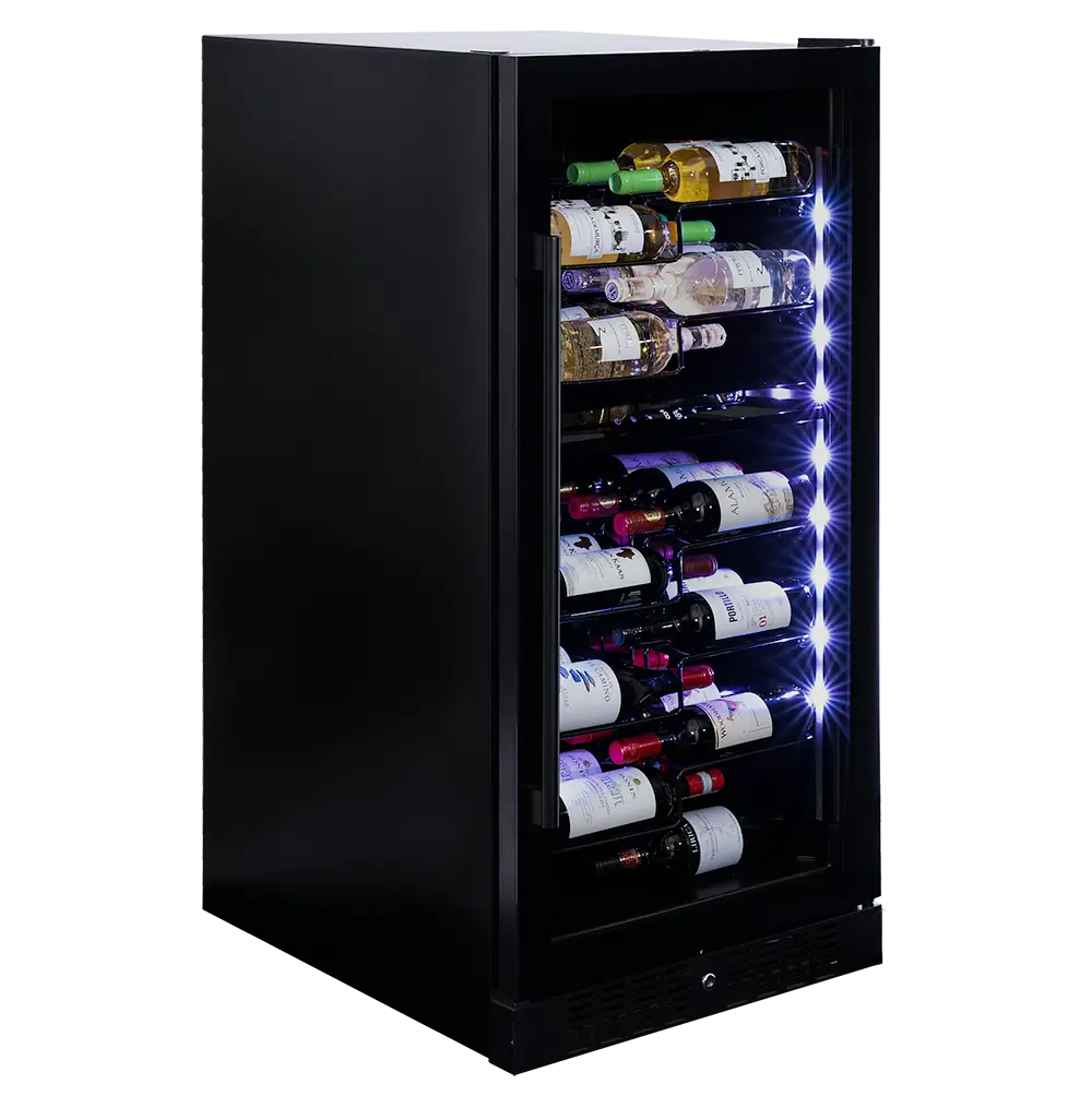 Dwustrefowy, wolnostojący model do przechowywania 58 butelek z serii Sera firmy Dunavox. Wyróżniająca się eleganckim wyglądem zewnętrznym i uchwytem ze stali nierdzewnej, DUNAVOX Sera-58 doskonale pasuje do nowoczesnych kuchni, restauracji i hoteli. Elegancki wygląd zewnętrzny i uchwyt ze stali nierdzewnej sprawiają, że DUNAVOX Sera -58 idealnie pasuje do nowoczesnej , kuchni. Butelki są umieszczone na opatentowanych półkach i oświetlone z dwóch stron białym, bursztynowym i niebieskim oświetleniem LED. Temperatura w górnej strefie musi być niższa niż w dolnej. Należy pamiętać, że ten model nadaje się do użytku wolnostojącego lub do zabudowy