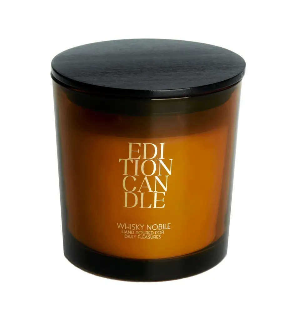 Prezentowana świeca 340 g o wymiarach 10 x 10,5 cm (śr. x wys.) jest częścią edycji Signature Amber (ESA) w stylu Modern Retro. Edycję tą charakteryzują skórzano-drzewne zapachy i bursztynowy kolor. Świeca wykonana została ręcznie z wosku sojowego i bawełny (trzy knoty). Jej eleganckie, minimalistycznie zdobione opakowanie zrobiono natomiast ze szkła (pojemnik), drewna bukowego i silikonu (wieczko). Produkt wyróżnia się francuską kompozycją zapachową Whisky Nobile o wysokim stężeniu w blendzie, którą tworzą: nuty głowy (słodowa whisky, czarny pieprz, róża), nuty serca (gałka muszkatołowa, goździki, bursztyn) oraz nuty bazowe (drzewo sandałowe, cedr, Patchouli). Czas palenia świecy wynosi maksymalnie 42 godziny.