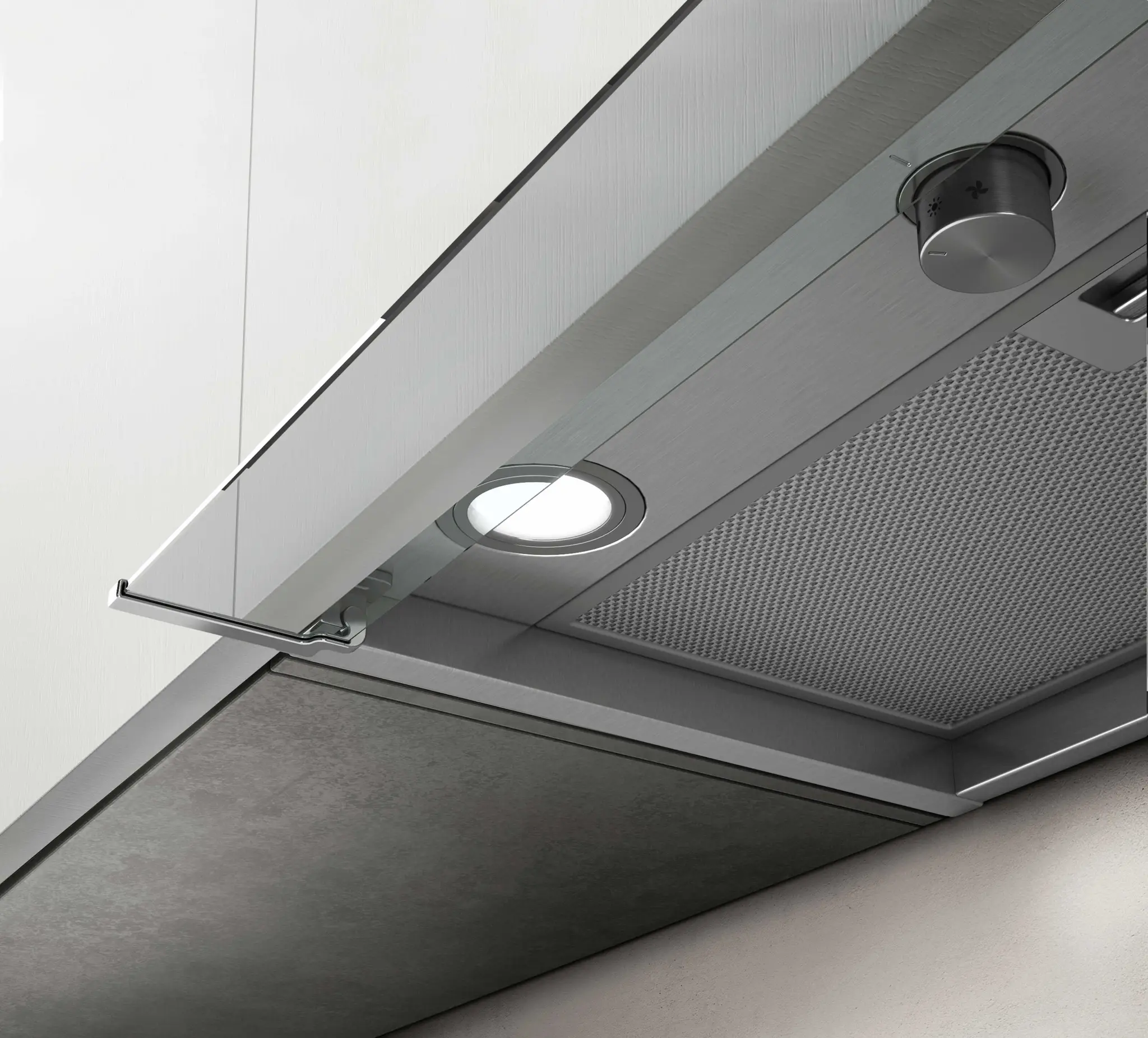 - Okapem zarządza się za pomocą okrągłego regulatora, który jest wygodny w użytkowaniu, a także łatwy w utrzymaniu czystości.