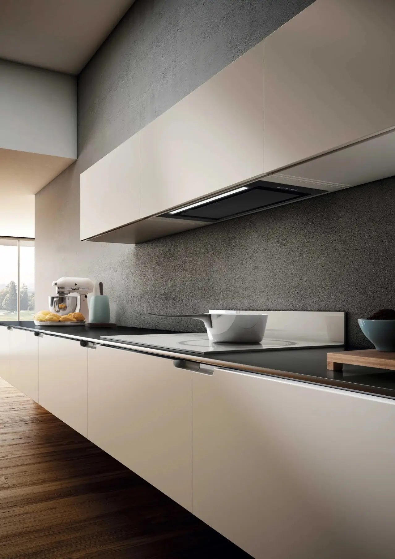 - Okap, całkowicie zintegrowany z szafką, gwarantuje w pełni płaski design w przypadku projektów kuchni liniowych.