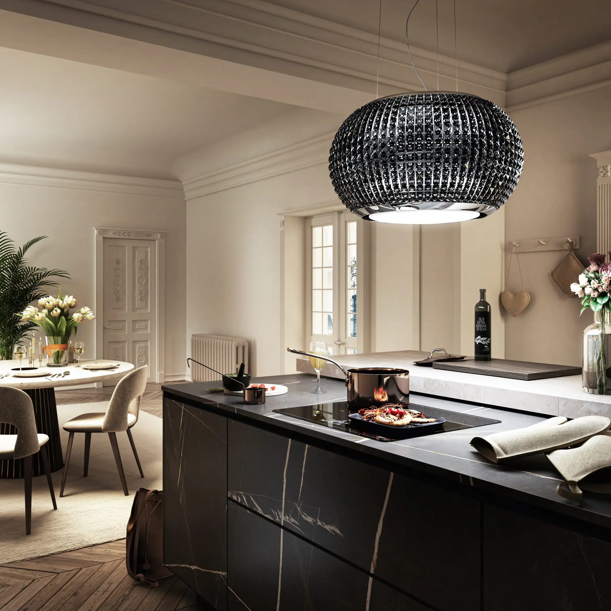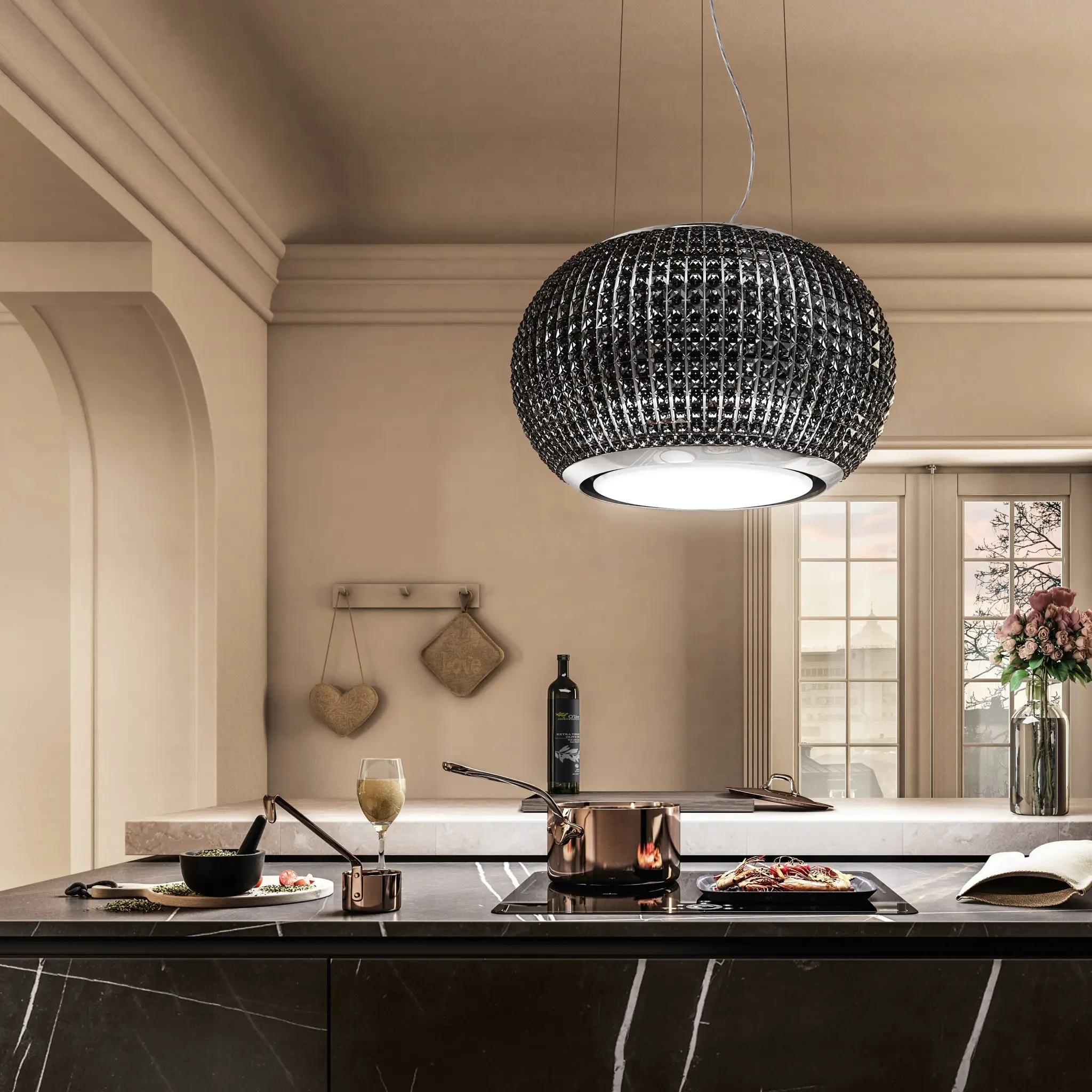 Niekwestionowana gwiazda w pomieszczeniu - a to wszystko dzięki obecności 1152 szklanych elementów, które tworzą magiczną grę światła i barw w pomieszczeniu. Ten wiszący okap jest wyrafinowany, ale jednocześnie zbalansowany. W ciągu dnia odbija naturalne światło, natomiast w godzinach wieczornych oświetla otoczenie tworząc ciekawe efekty optyczne.