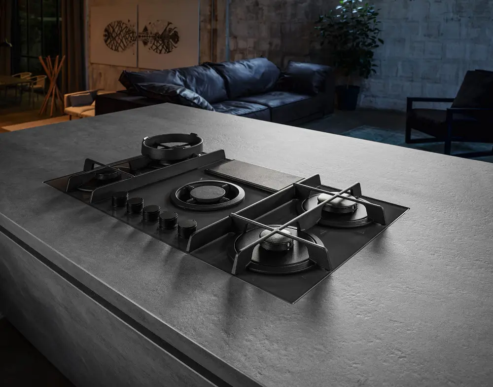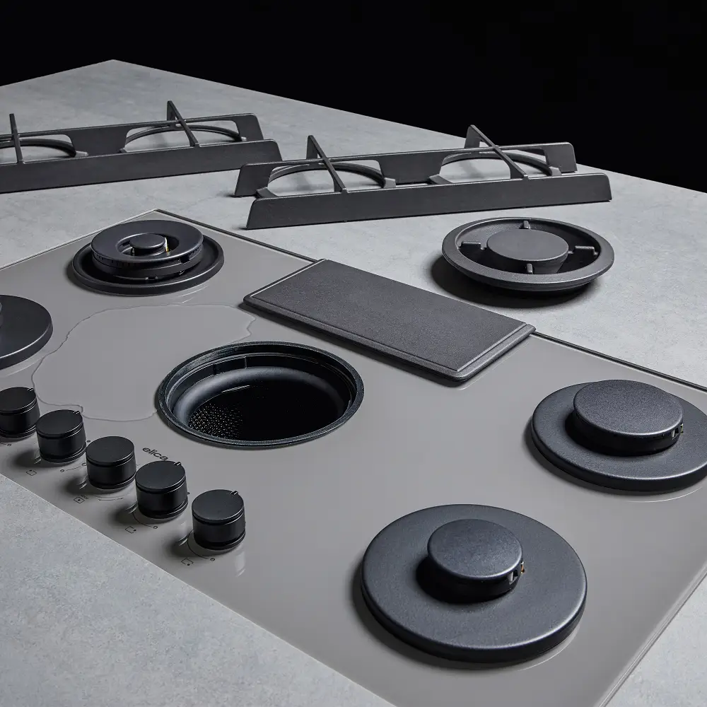 Jest to pierwsza na rynku płyta gazowa z systemem wyciągowym, która skutecznie pochłania opary bezpośrednio z powierzchni gotowania. Zastosowanie żeliwnych elementów gwarantuje nie tylko estetykę, ale i funkcjonalność. Zamknięte i płaskie ruszty krzyżowe zapewniają stabilność garnków oraz ułatwiają ich przesuwanie po powierzchni płyty.
