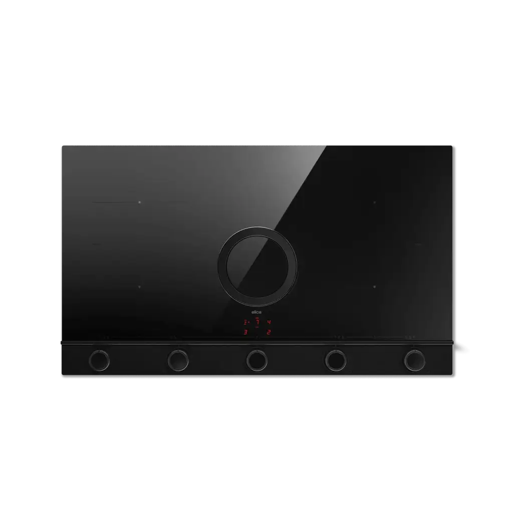Wykończenie w kolorze czarnym z detalami ze stali nierdzewnej sprawia, że płyta doskonale komponuje się z nowoczesnymi wnętrzami. Centralna szklana i metalowa klapa subtelnie ukrywa system ssący, tworząc jednolity i estetyczny wygląd.