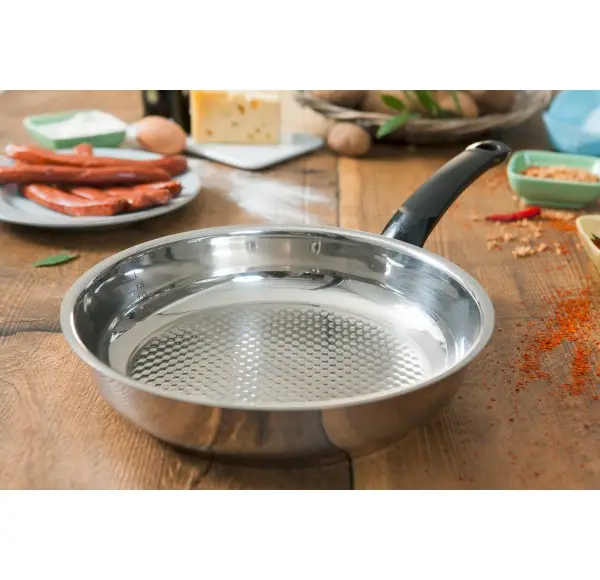 Patelnia Cripsy Steelux Comfort została wykonana z najwyższej jakości stali nierdzewnej. Od wewnątrz pokryta jest powłoką Novogrill, umożliwiającą smażenie w niewielkiej ilości tłuszczu, oraz przypiekanie potraw jak na grillu. Posiada też bezpieczny, nie nagrzewający się uchwyt, a otwór w nim daje możliwość zawieszenia patelni na haku. Wewnątrz patelni znajduje się miarka, która pozwala na określenie ilości płynu. Dno Super-Thermic nadaje się na wszystkie rodzaje kuchenek, także indukcyjną.