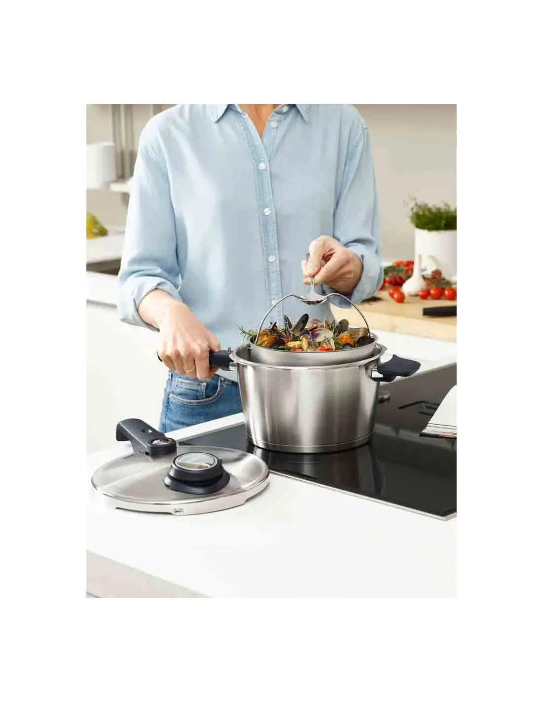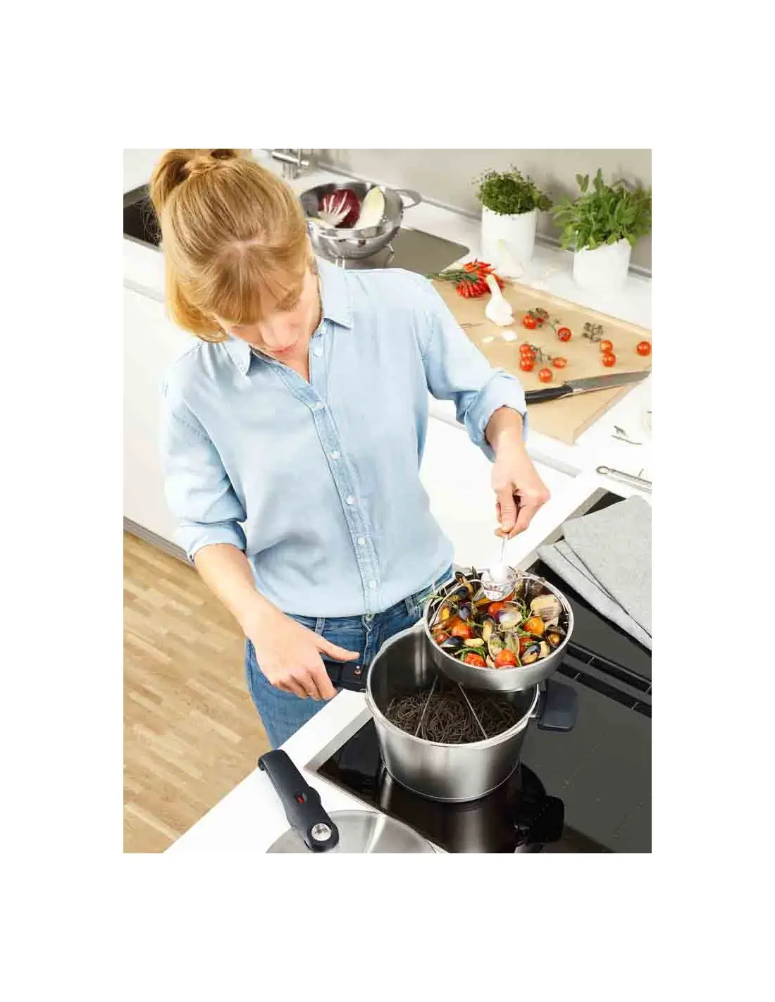Urządzenie wykonane z wysokiej jakości stali nierdzewnej, można go używać na każdym typie kuchenki (również na indukcji). Posiada wygodną rączkę do przenoszenia. Pokrywę łatwo zakłada się, dzięki oznaczeniom, które wystarczy do siebie dopasować.