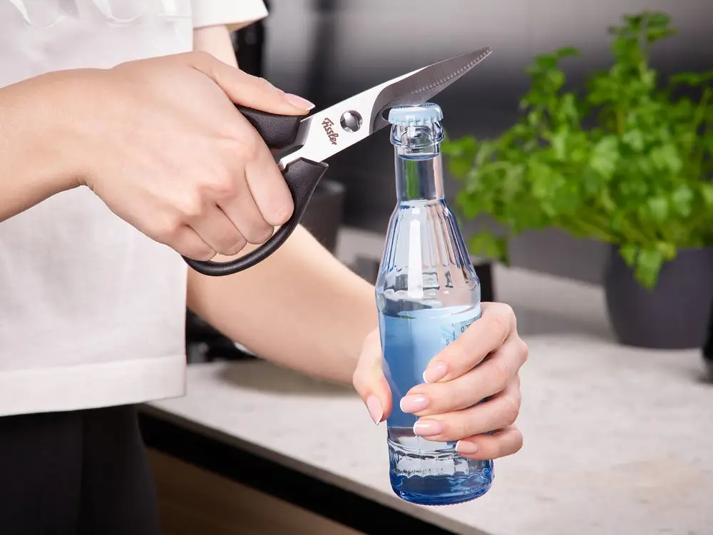 Dodatkową funkcjonalność zapewnia zintegrowany otwieracz do butelek, dzięki czemu nożyczki stają się jeszcze bardziej uniwersalnym narzędziem w kuchni.