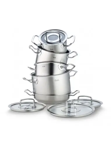 Wykonana z wysokiej jakości satynowanej stali nierdzewnej 18/10, Original Profi Collection jest łatwa w pielęgnacji, niezwykle trwała i niewrażliwa na rdzę . Dzięki tej podstawie naczynia nadają się do wszystkich rodzajów kuchenek i są zoptymalizowane pod kątem kuchenek indukcyjnych. Jego przemyślana konstrukcja umożliwia optymalną absorpcję, dystrybucję i przechowywanie ciepła. Charakterystyczne dla serii izolowane metalowe uchwyty gwarantują przyjemną temperaturę chwytu podczas gotowania i przenoszenia naczynia.