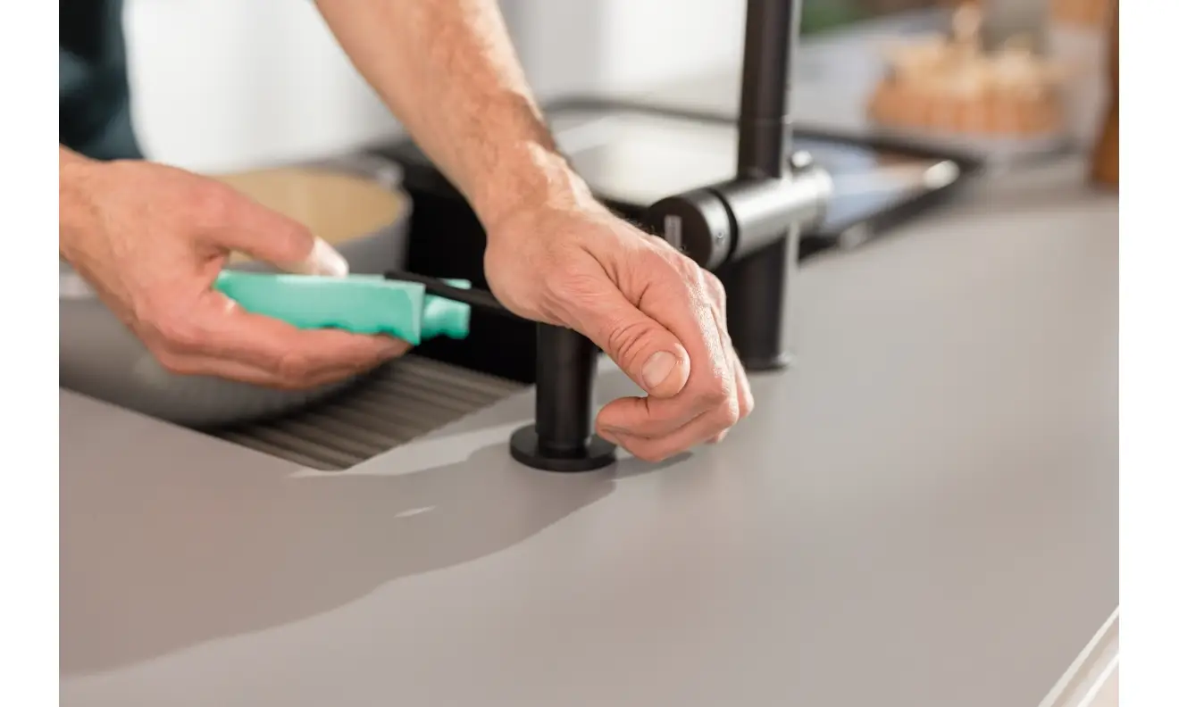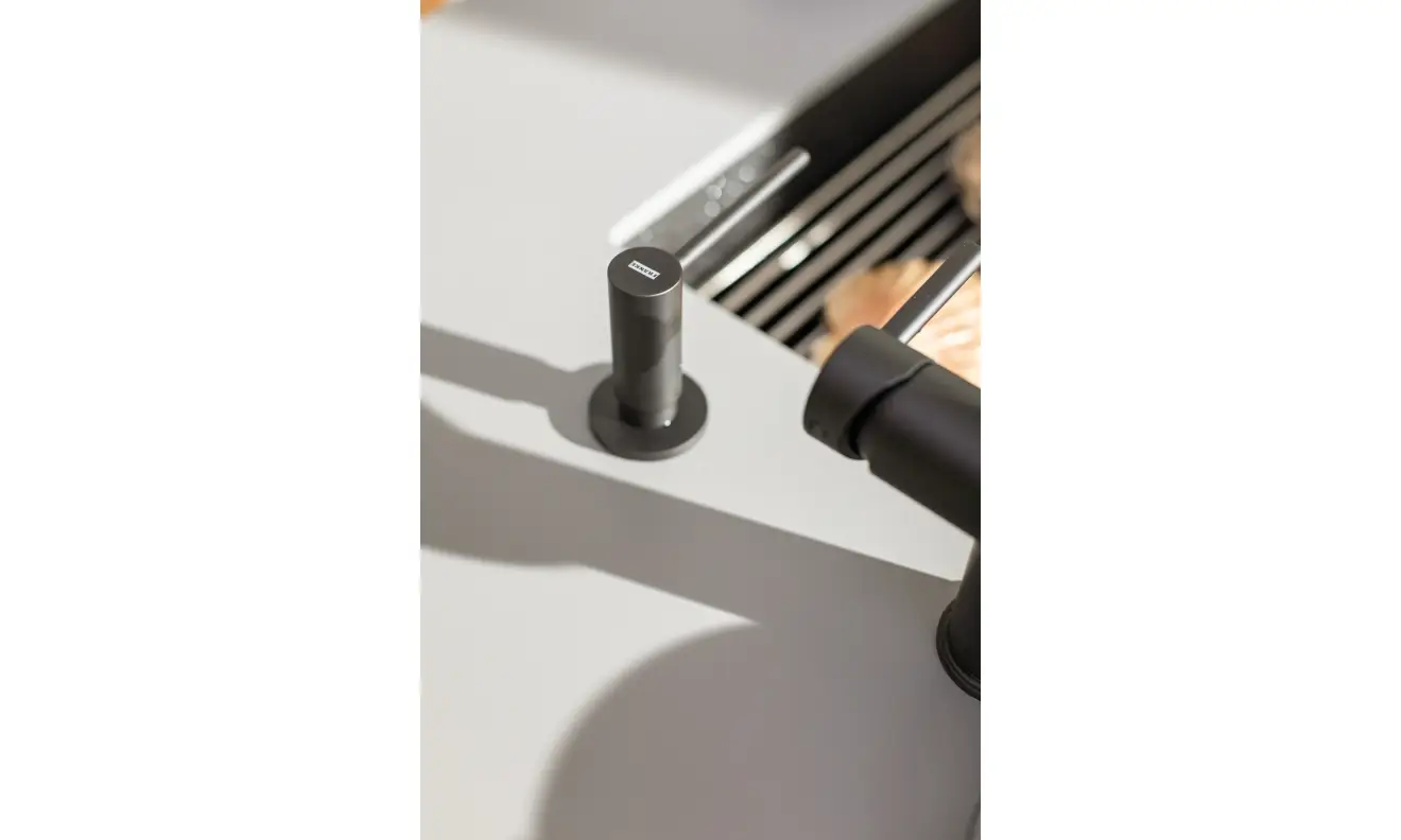 Butelka na płyn umieszczona jest pod zlewozmywakiem lub blatem, a na powierzchni zostaje jedynie estetyczna końcówka z dozownikiem, który łatwo uzupełnimy od góry.