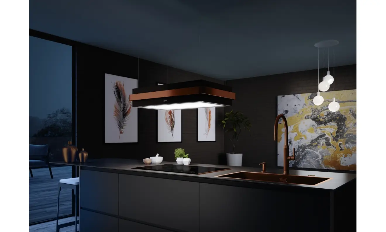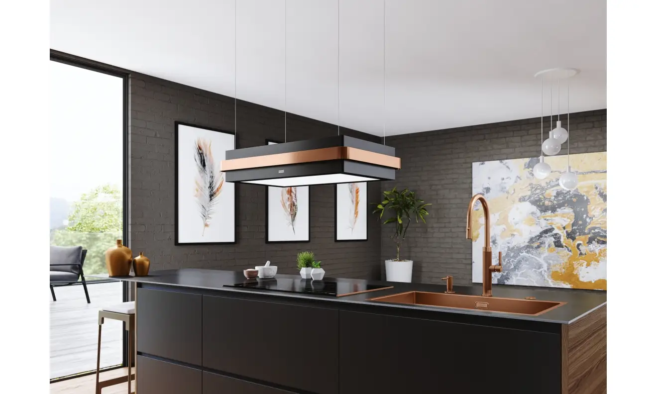 Franke Mythos Masterpiece FMYS BK/CP F80 KL to wyspowy okap kuchenny klasy premium, zaprojektowany z myślą o współczesnych kuchniach, które łączą funkcjonalność z estetyką. Model wykończony w kolorze BK Extra Matt z pierścieniem w odcieniu miedzi (Copper Ring) doskonale komponuje się z innymi urządzeniami z kolekcji Mythos Masterpiece.