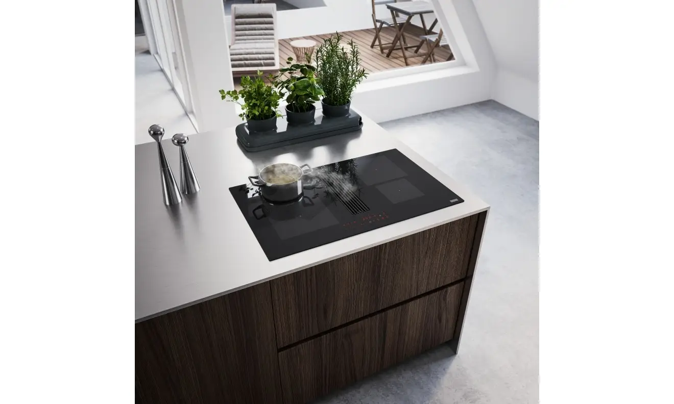 Bezramkowa płyta indukcyjna z czarnym szkłem może być wbudowana w blat lub zamontowana na równi z blatem. Okap uruchamia się automatycznie po włączeniu płyty i dostosowuje moc pochłaniania do poziomu intensywności jej pracy. Wydajny okap klasy energetycznej A+ usuwa zapachy i cząstki tłuszczu bezpośrednio znad naczyń. Wlot zlicowany jest z powierzchnią płyty, co umożliwia przesuwanie naczyń bez konieczności ich podnoszenia.