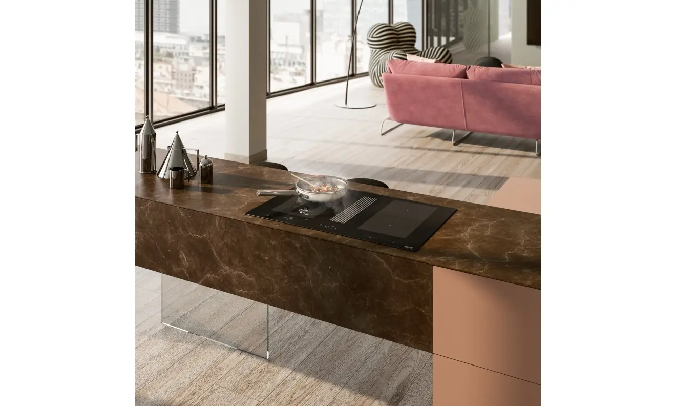Bezramkowa płyta indukcyjna z czarnym szkłem może być wbudowana w blat lub zamontowana na równi z blatem. Okap uruchamia się automatycznie po włączeniu płyty i dostosowuje moc pochłaniania do poziomu intensywności jej pracy. Wydajny okap usuwa zapachy i cząstki tłuszczu bezpośrednio znad naczyń. Wlot zlicowany jest z powierzchnią płyty, co umożliwia przesuwanie naczyń bez konieczności ich podnoszenia.
