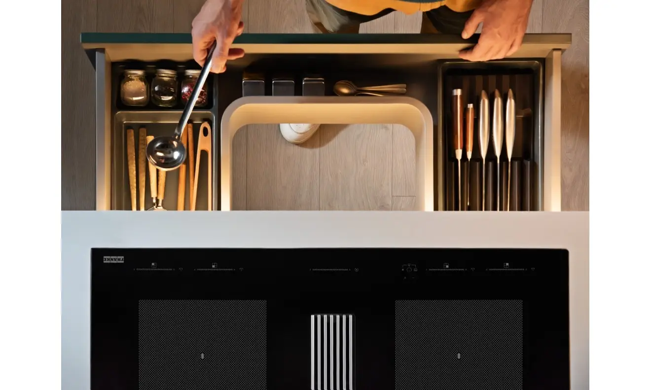 Płyta oraz okap są obsługiwane za pomocą panelu dotykowego na szkle o białym podświetleniu, a wszystkie elementy elektroniczne, łącznie z silnikiem, są wodoszczelne na wypadek zalania. Ten model posiada klasę energetyczną A+. Istnieje możliwość dokupienia dodatkowych elementów do odprowadzania powietrza.