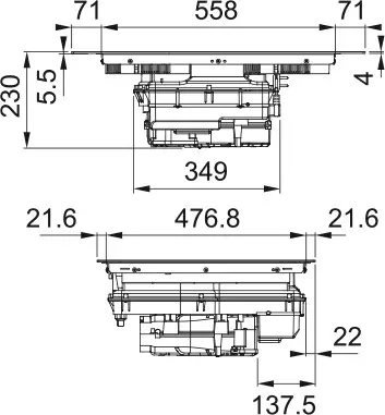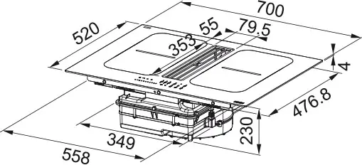 Wyposażony jest w wodoodporne komponenty oraz system gromadzenia wyciekłych płynów. Płyta posiada 4 pola i 2 strefy Bridge z możliwością zintegrowania pól oraz funkcje BOOSTER. Płyta oraz okap są obsługiwane za pomocą panelu dotykowego na szkle o czerwonym podświetleniu.