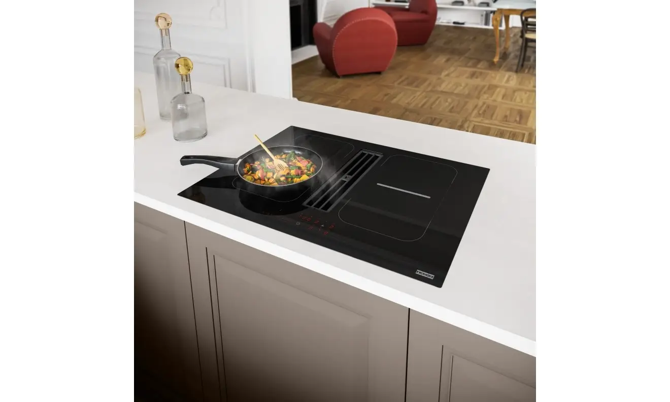 Bezramkowa płyta indukcyjna z czarnym szkłem może być wbudowana w blat lub zamontowana na równi z blatem. Okap uruchamia się automatycznie po włączeniu płyty i dostosowuje moc pochłaniania do poziomu intensywności jej pracy. Wydajny okap klasy energetycznej A+ usuwa zapachy i cząstki tłuszczu bezpośrednio znad naczyń.