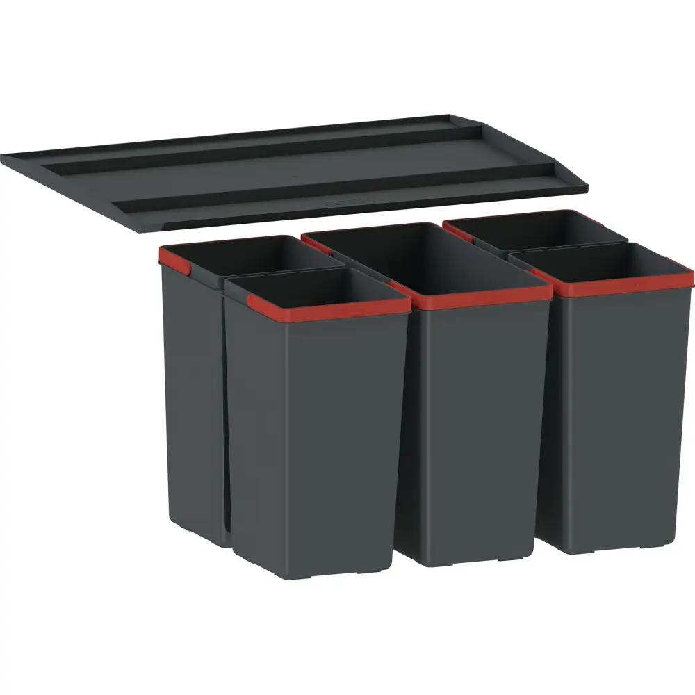 Sortownik odpadów Easy Sort 600-0-4 z pokrywą posiada 5 pojemników. Dzięki specjalnej technologii produkcji pojemniki oraz pokrywa są antyseptyczne, co zapewnia redukcje rozwoju bakterii do 99%. Sortownik został wykonany z materiału pochodzącego z recyklingu i jest łatwy w czyszczeniu. Rekomendowany montaż w szafce z wysokim, wysuwanym frontem. Przy montażu w szafce zlewozmywakowej należy dokupić przedłużkę uniwersalną (112.0193.038 patrz akcesoria Franke).