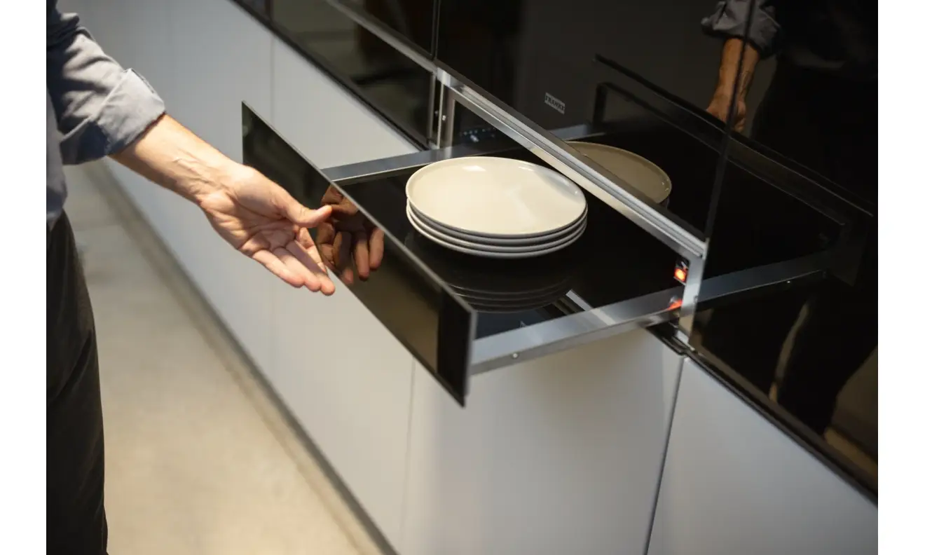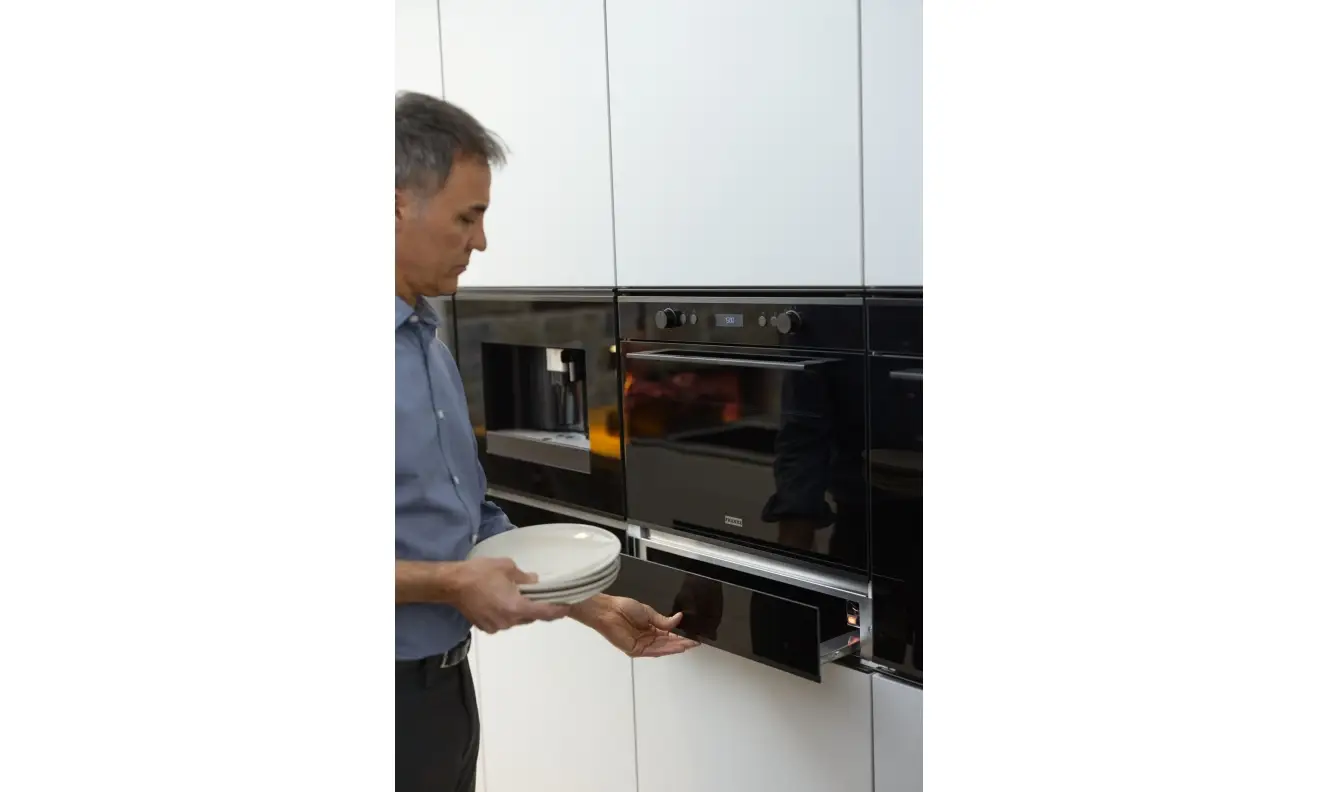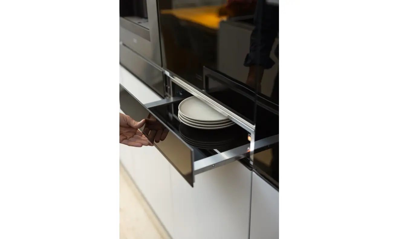 Szuflada oferuje szeroki zakres temperatury od 45 do 75°C. Może być zamontowana pod ekspresem lub innym urządzeniem kompaktowym, aby idealnie dopasować się do linii mebli. Nie służy tylko do podgrzewania filiżanek i talerzy. Możemy ją również wykorzystać do utrzymywania potraw w cieple, rozmrażania lub delikatnego gotowania. Ten model posiada elegancką czarną powierzchnię ze szkła i dodatkowe detale ze stali.