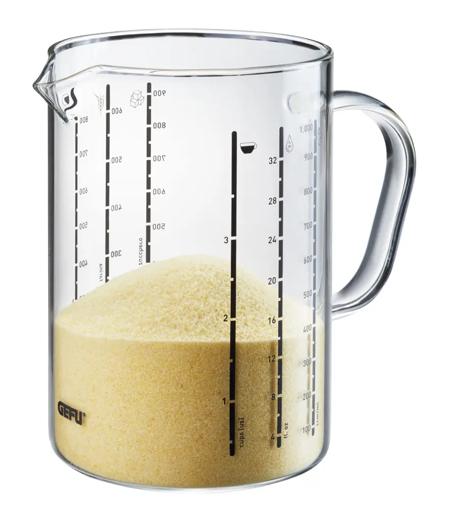 - czytelne skale w kilku jednostkach (ml / cm3 / fl. oz / kubki (USA) / cukier / mąka / ryż)