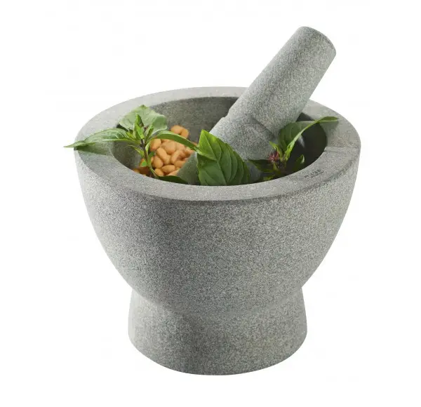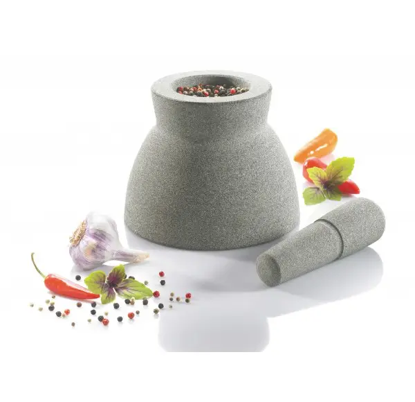 Moździerz ten znajduje szerokie zastosowanie w każdej kuchni. Naczynie posiada dwie komory robocze po obydwu stronach: jedną małą, a drugą większą. Doskonale nadaje się do ugniatania przypraw, a także znajdzie zastosowanie przy przygotowywaniu wszelkich past ziołowych. Wyposażona jest w dobrze leżący w dłoni, dwustronny tłuczek. Całość wykonana została z granitu.