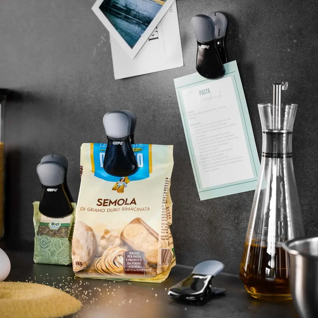 Zaciski PERTO to niezawodne akcesoria kuchenne, które skutecznie zamykają otwarte opakowania i pomagają zachować świeżość produktów spożywczych. Dzięki solidnej sprężynie i antypoślizgowemu uchwytowi idealnie nadają się do zamykania torebek z chipsami, przyprawami, kawą i wieloma innymi artykułami spożywczymi.