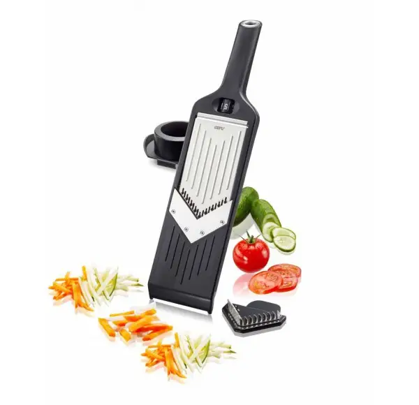 Krajacz wykonany został z tworzywa sztucznego. Przeznaczony jest do wszelkiego rodzaju warzyw lub owoców. Posiada dwa rodzaje ostrz ze stali nierdzewnej: ostrze do krojenia w plastry oraz wymienne ostrza do cięcia paski o szerokości 3 i 6 mm. Posiada 5 stopniową regulację grubości: od 1 do 5 mm. W skład kompletu wchodzi plastikowy uchwyt do trzymania krojonego warzywa lub owocu, co zapewnia wygodę i bezpieczeństwo. Produkt nadaje się do mycia w zmywarce.