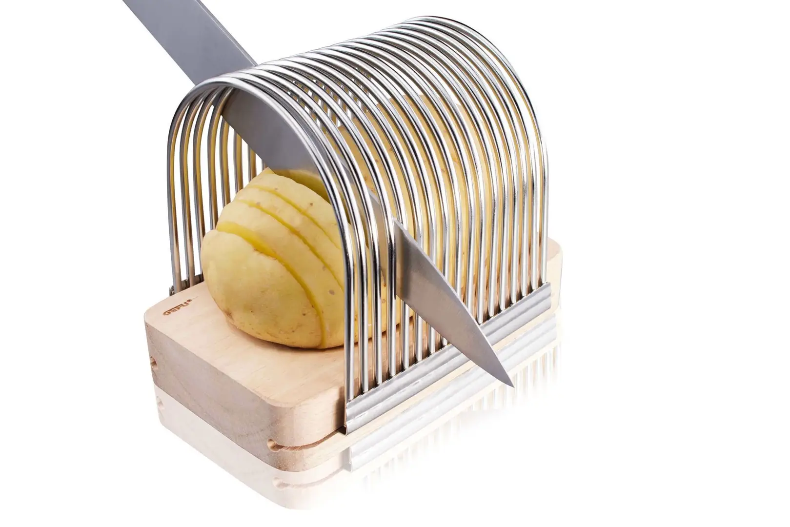 Stabilne, metalowe łuki prowadzą nóż prosto i równo, a kolce na podstawie przytrzymują ziemniaka w miejscu. Podwyższona powierzchnia robocza zwiększa bezpieczeństwo użytkowania. Idealna także do innych warzyw, takich jak cebula, cukinia czy pomidor.
