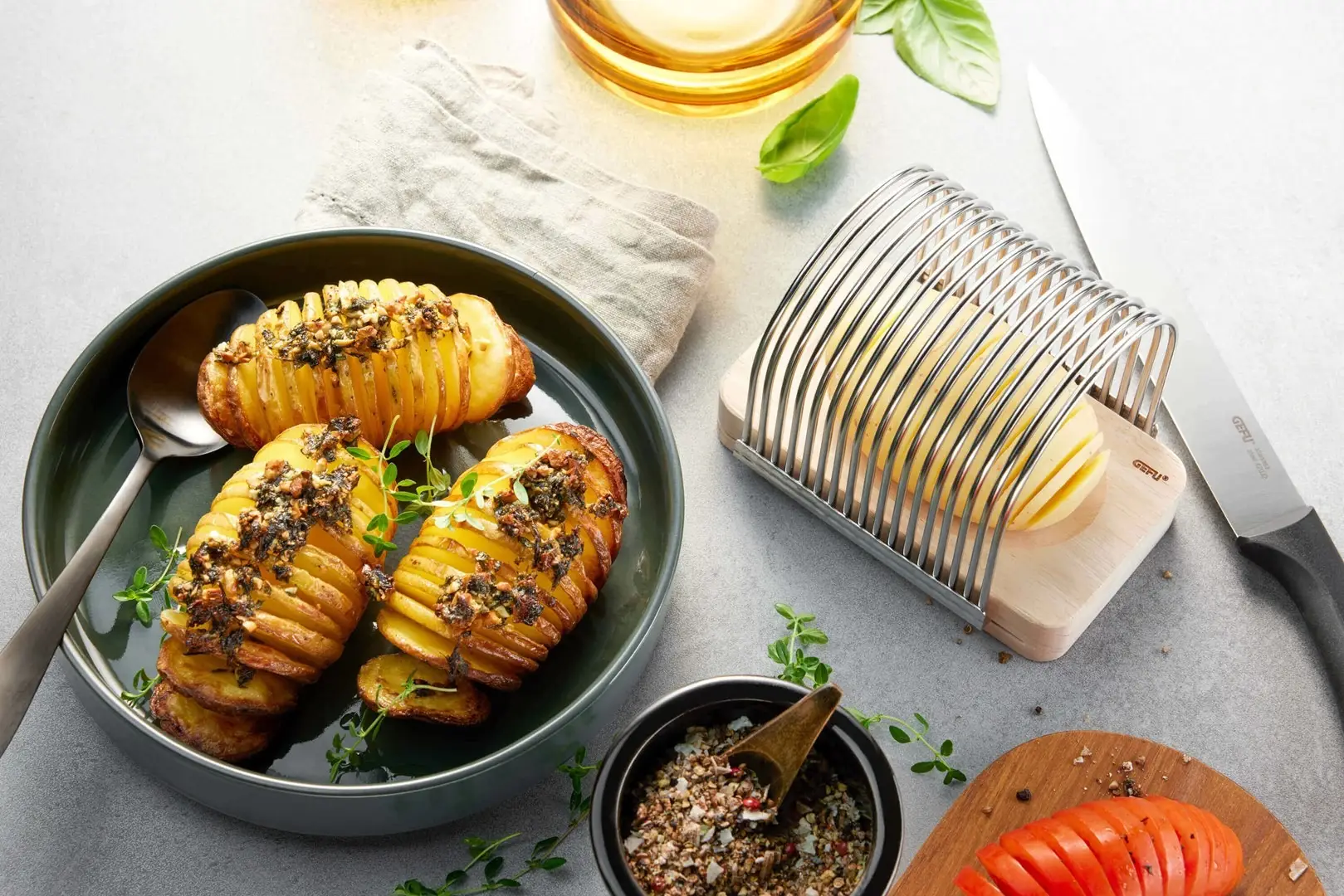 Masz ochotę na nieodparcie chrupiące plasterki ziemniaków? Żaden problem, bo dzięki krajarce HASSEL ziemniaki można łatwo pokroić w idealny kształt wachlarza – bez ryzyka przypadkowego rozerwania warzywa. To akcesorium, które otwiera drzwi do kreatywnych przepisów i aromatycznych nadzień.